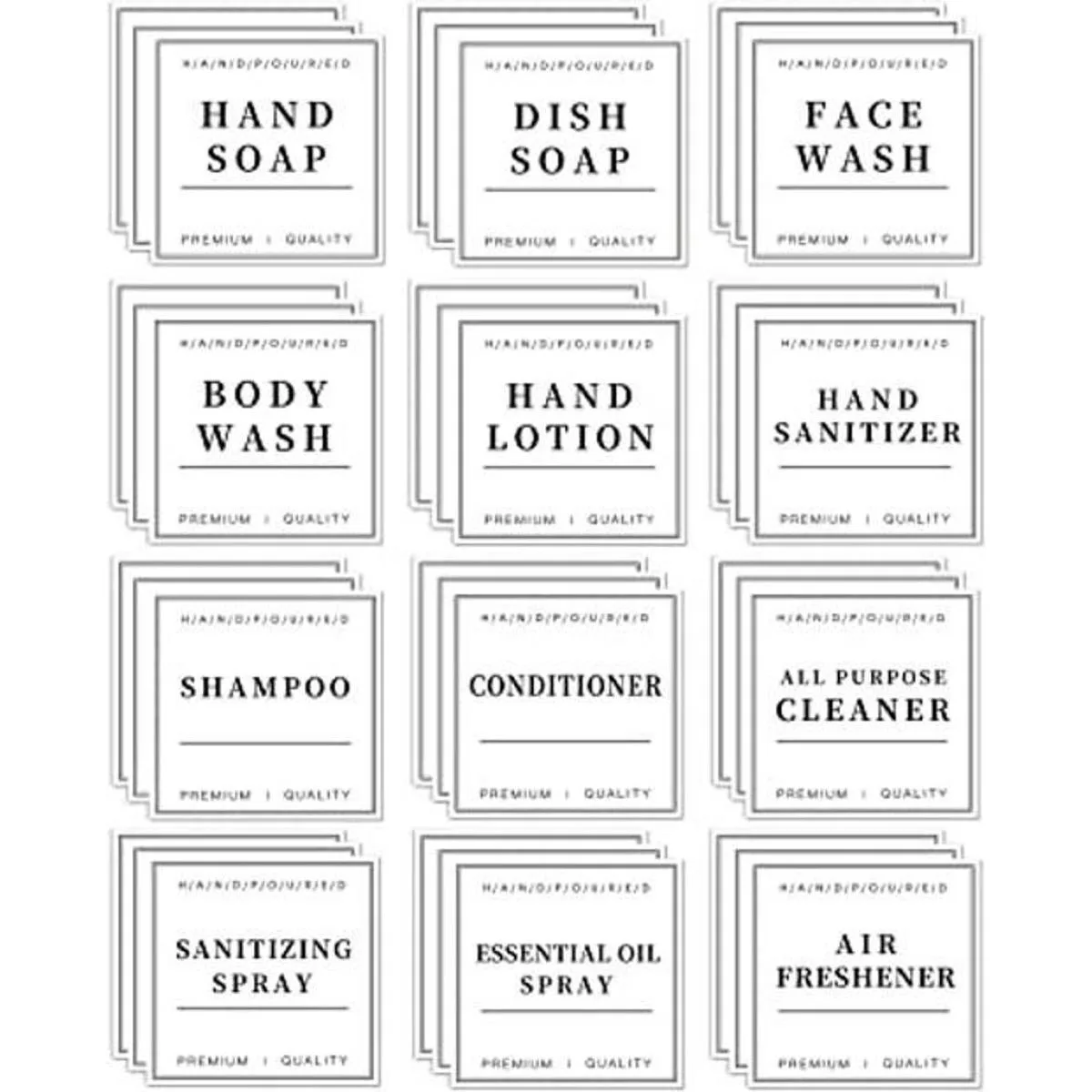 36 etiquetas impermeables para botellas, loción de jabón de manos, champú y acondicionador, etiquetas de limpieza extraíbles para botellas de vidrio o plástico