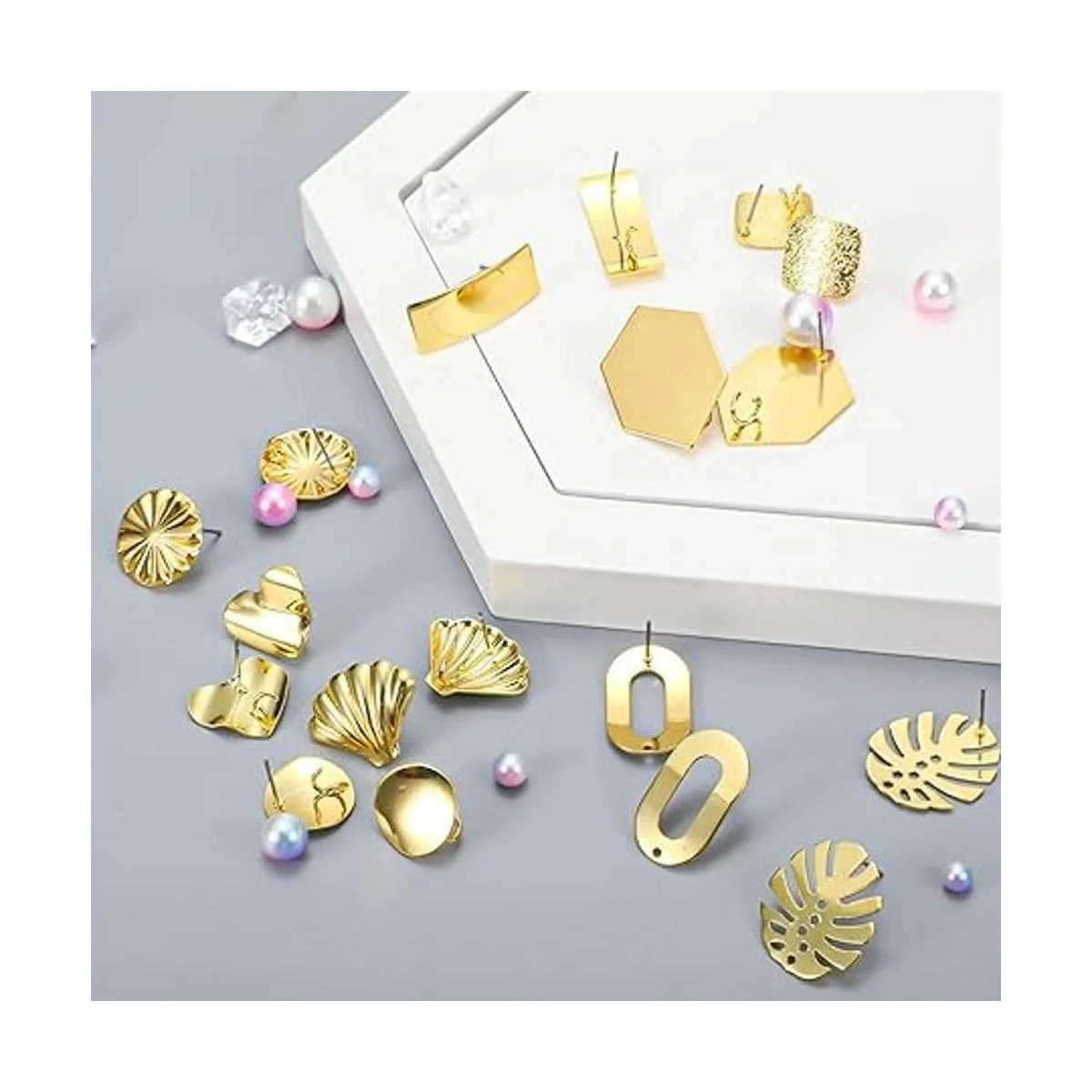 36 piezas 18 pares de aretes chapados en oro con agujero de bucle, kit de tachuelas para las orejas, incluyendo forma de palma, concha de flor, postes de base de oreja, forma hexagonal rectangular hueca para la fabricación de aretes de joyería