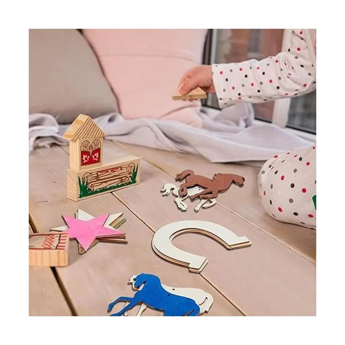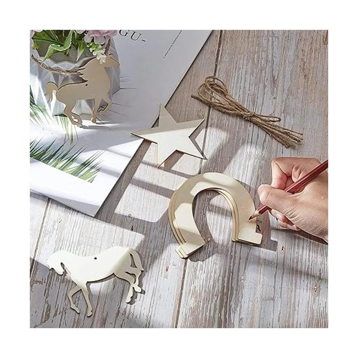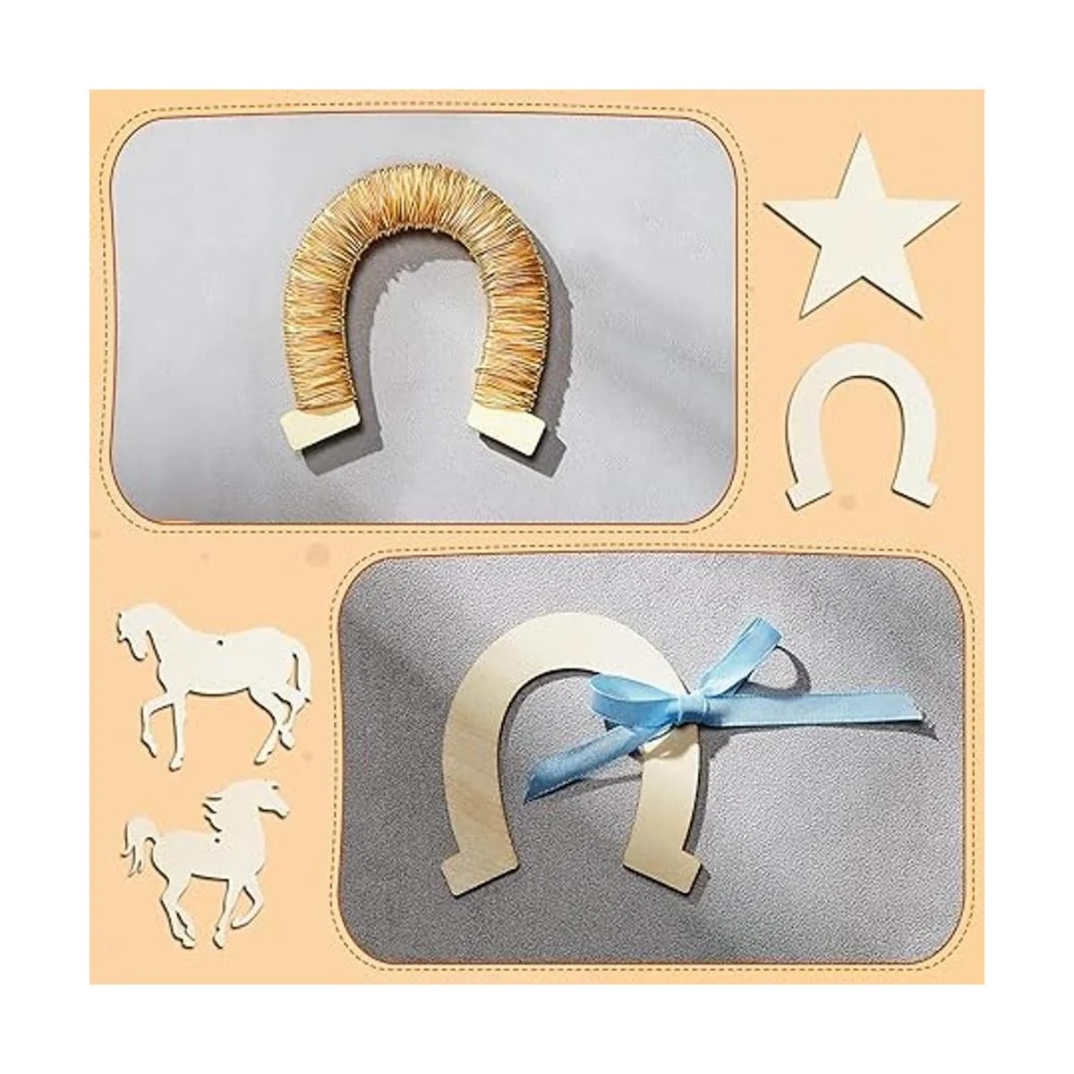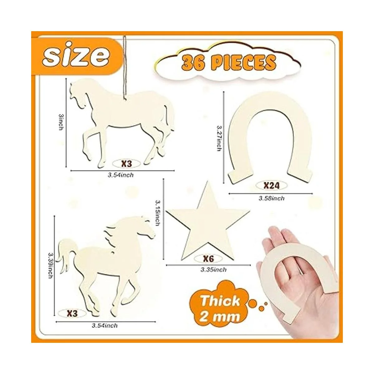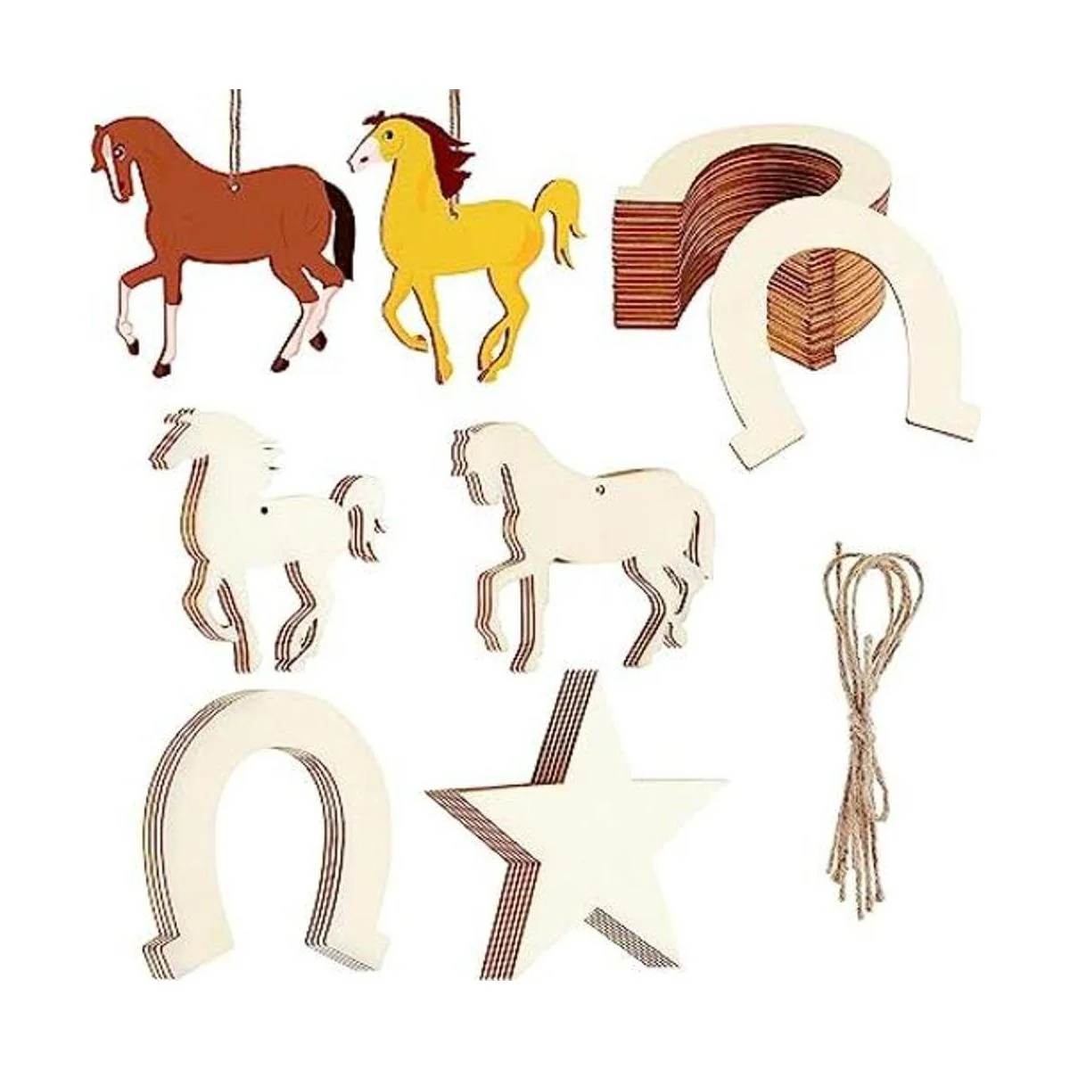 Múltiples formas: recibirás un juego completo de piezas de madera sin terminar y 1 pieza de cuerda a juego, hay 24 piezas de herraduras, 3 piezas de caballos con cabezas arqueadas, 3 piezas de caballos con melenas y 6 piezas de madera en forma de estrellas, múltiples formas y cantidades que pueden satisfacer tus diferentes necesidades de uso