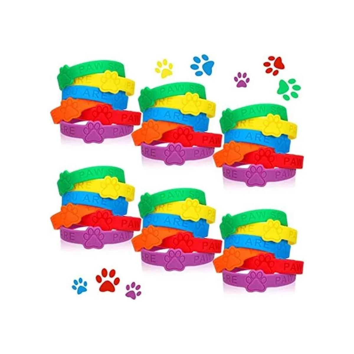 36 pulseras de silicona con estampado de patas, pulseras elásticas de goma con estampado de patas, pulseras elásticas de 6 colores sólidos, pulseras impermeables para huecograbado para actividades estudiantiles y suministros de fiesta