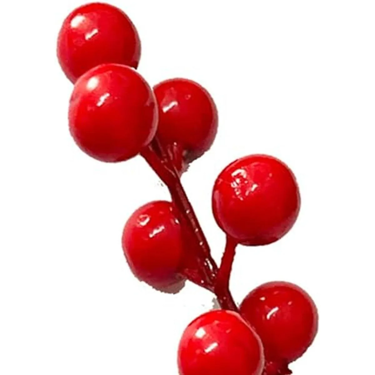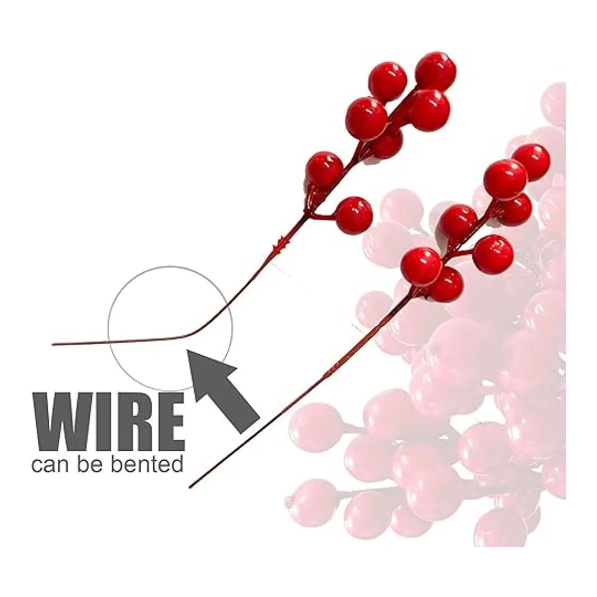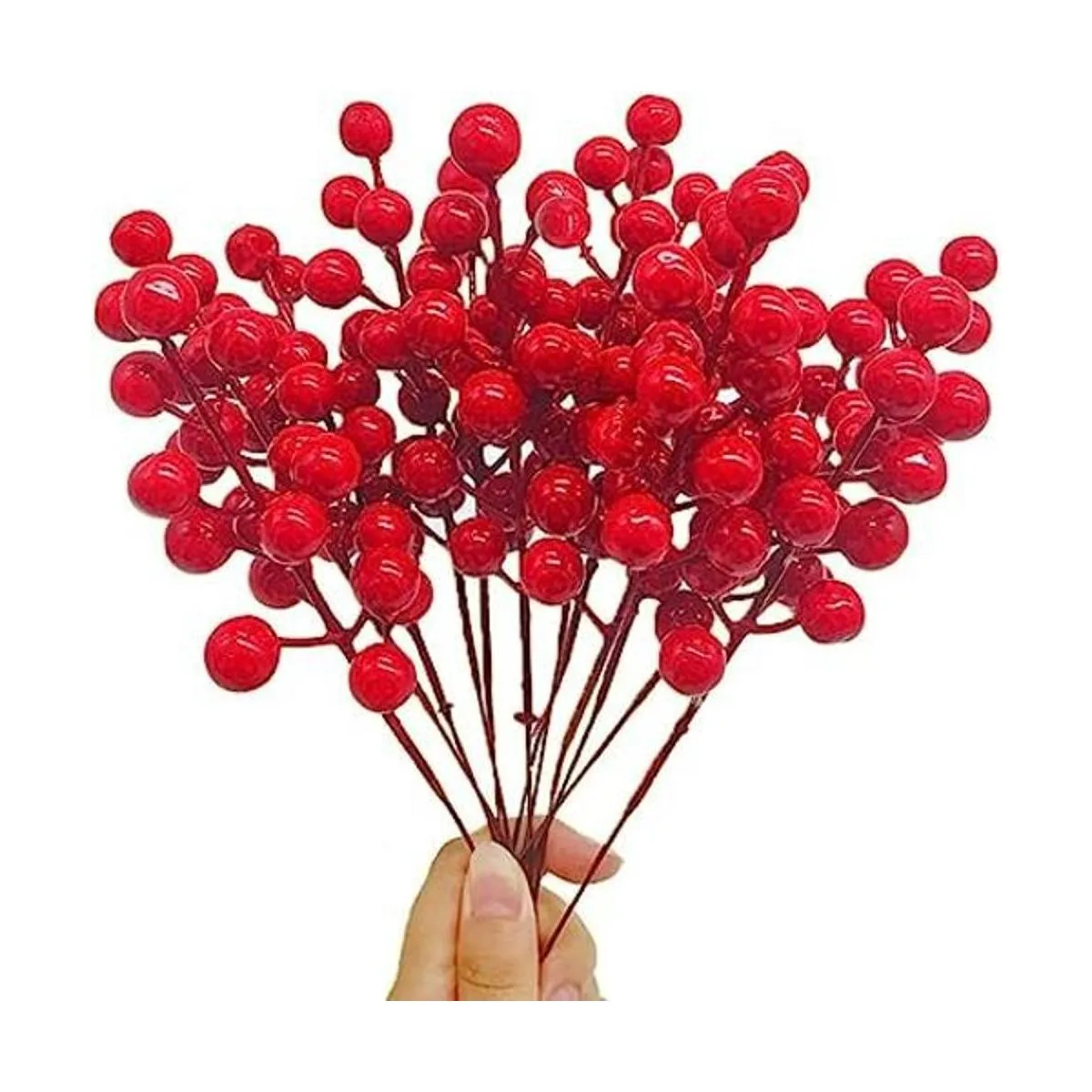 Duradero e impermeable: los tallos están hechos de alambre de hierro. Las bayas están hechas de tono. Son inodoros y seguros y se pueden utilizar durante mucho tiempo. Y el tallo de la ramita de bayas rojas es impermeable. Se puede decorar en interiores y exteriores o remojar en agua