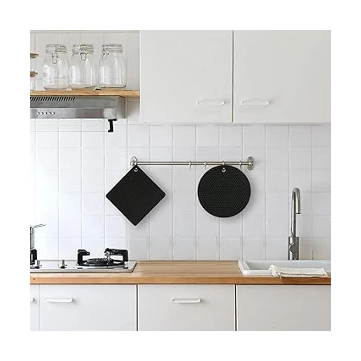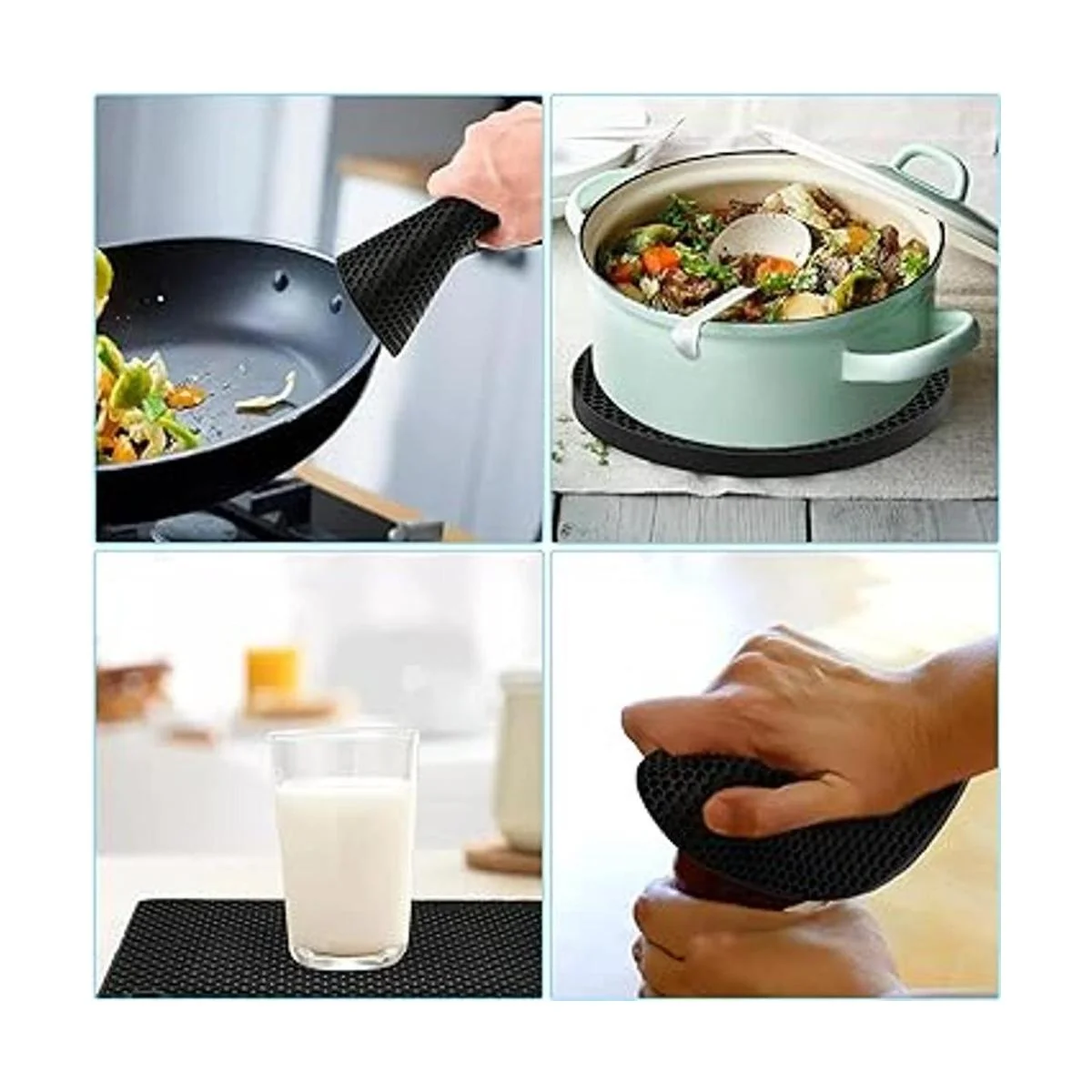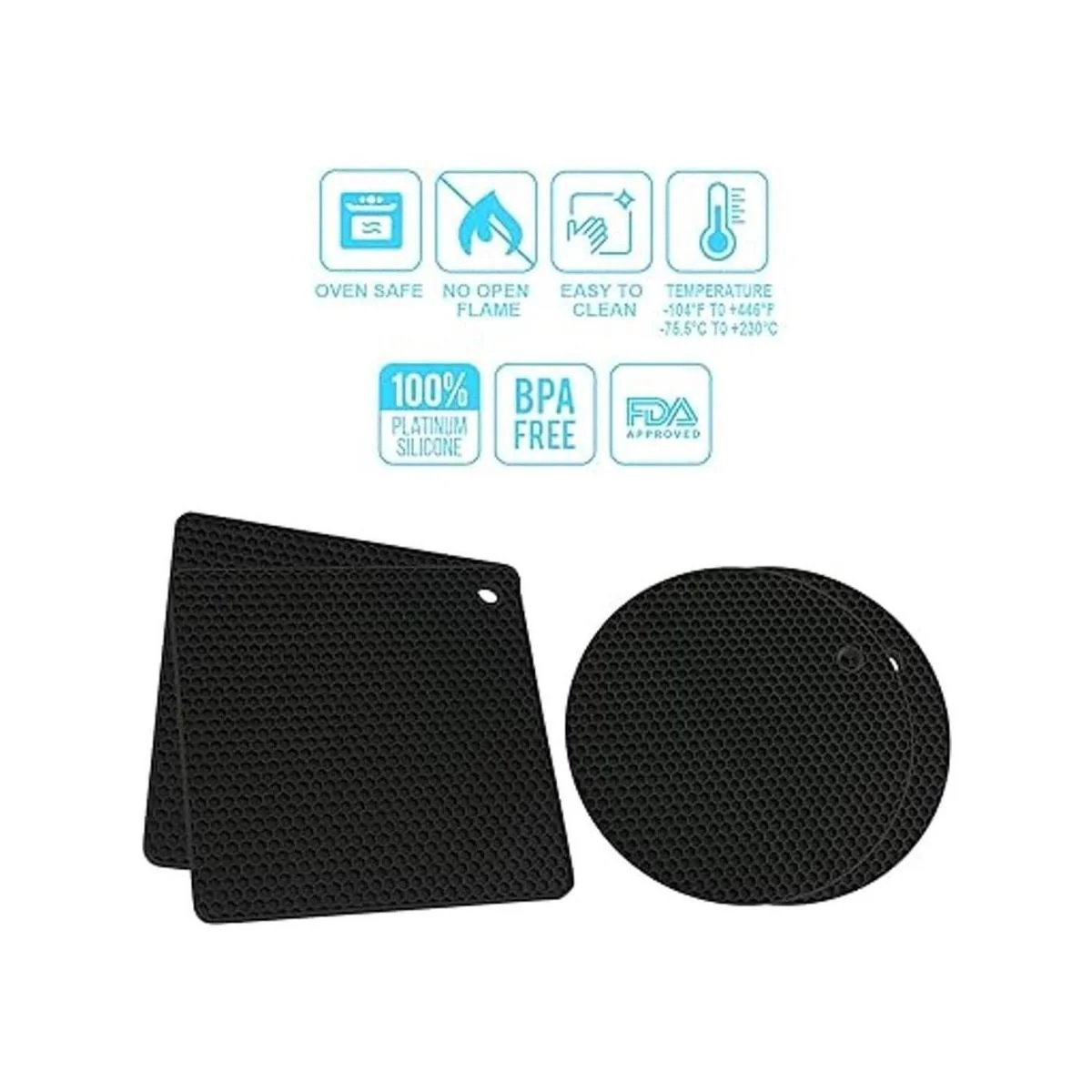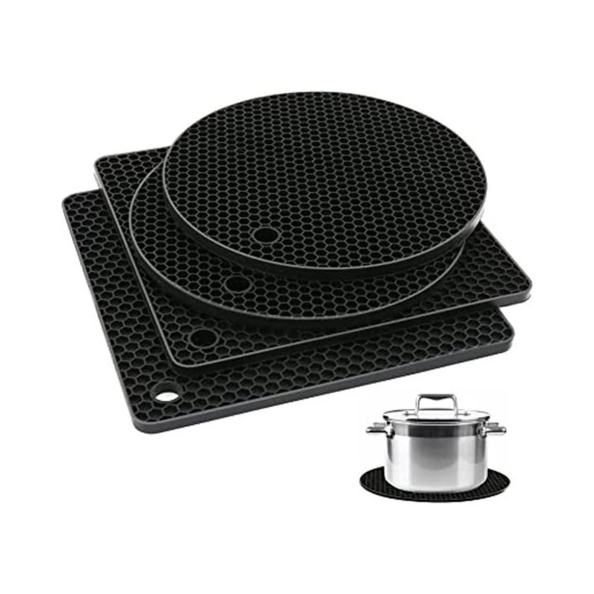 Fácil de limpiar: los soportes de goma para ollas están hechos de silicona de grado alimenticio, y son fáciles de limpiar y almacenar. Cada salvamanteles de silicona tiene un agujero en la esquina para un almacenamiento cómodo para colgar, es fácil de secar apretando o agitando y se puede plegar repetidamente.