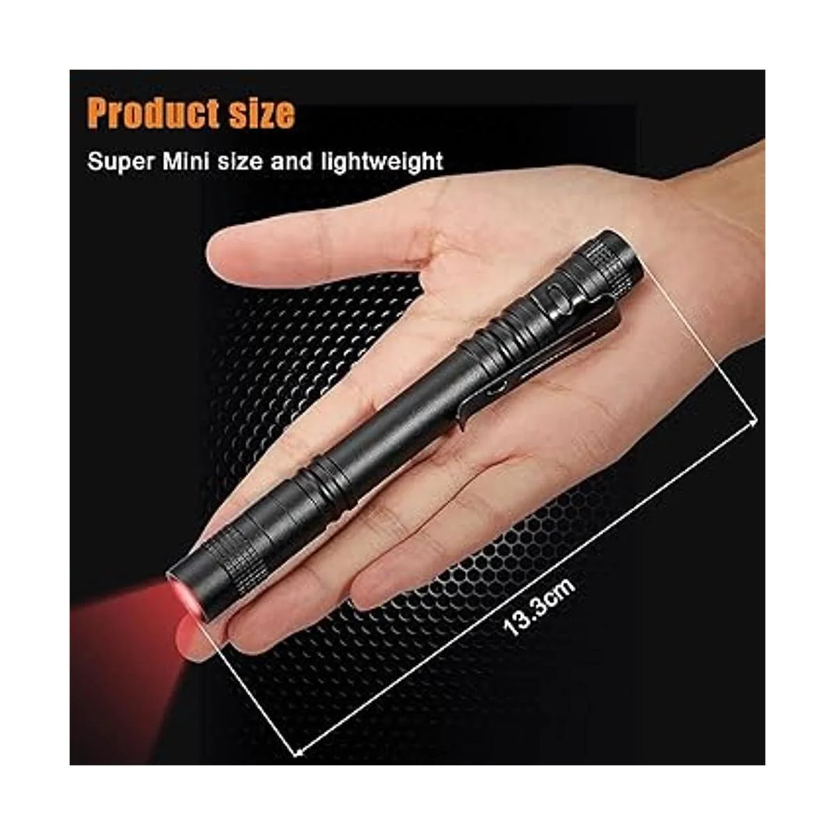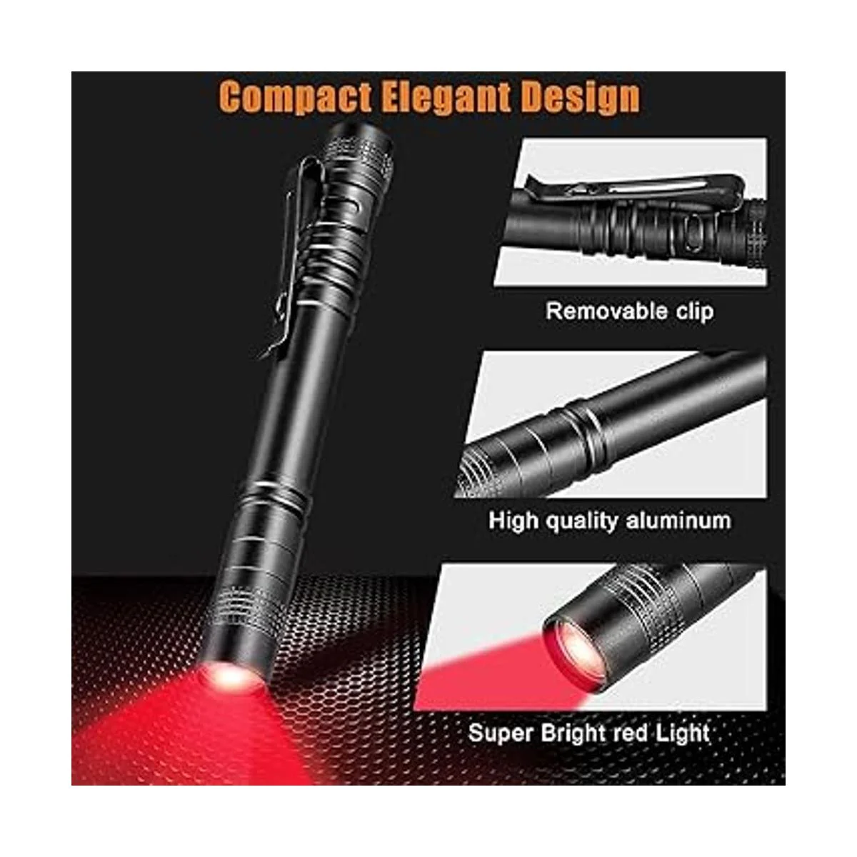 Diseño de un modo: nuestra linterna LED roja tiene solo un modo de interruptor encendido/apagado, que es un diseño inteligente y humanizado; tal vez haya algún problema para cambiar entre 3 modos o 5 modos para decidir qué modo usar, especialmente cuando tienes muchas cosas en la mano, por lo que la linterna LED roja de modo único será muy práctica y adecuada para tu trabajo eficaz