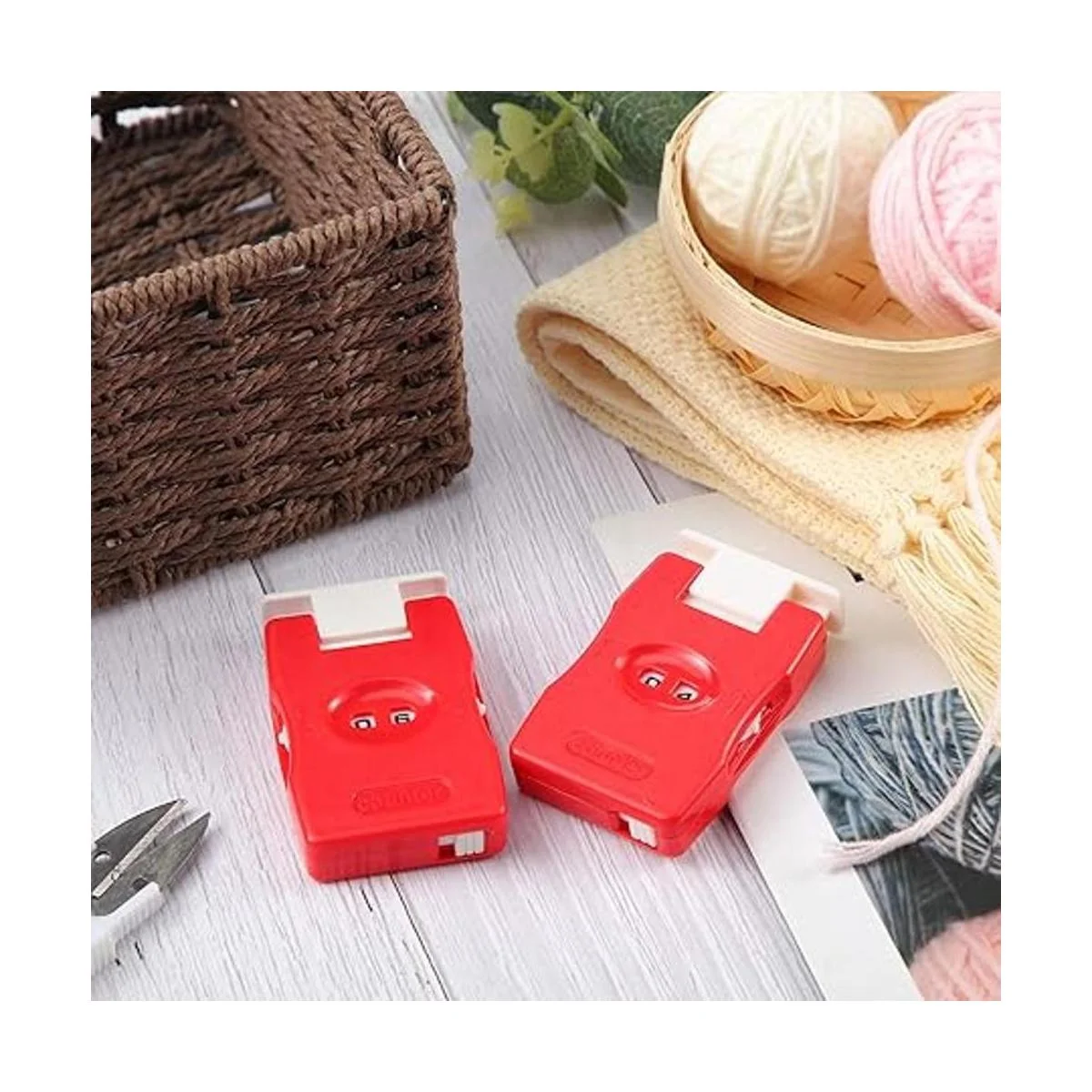 Cómo utilizar: pon el contador de puntadas en la aguja del suéter cuando tejes. Puedes grabar el número de agujas pulsando el botón blanco de arriba, o rodar el rodillo derecho y rodar la rueda izquierda para ajustar los dos dígitos y el rango de grabación es: 0 a 99