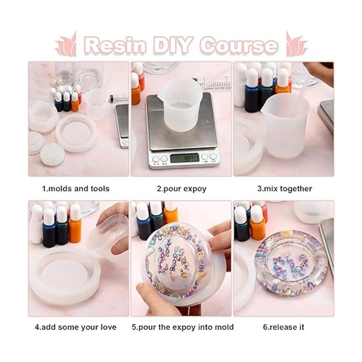 Fácil de hacer: llénalos con resina epoxi, de acuerdo a tu preferencia, añade algunas decoraciones, tinte de resina líquida, flores secas, cuentas o cualquier cosa que te guste, y espera que termine, solo tienes que girar los moldes de resina de silicona y liberar tu creación de tus moldes después de que la resina esté completamente curada.