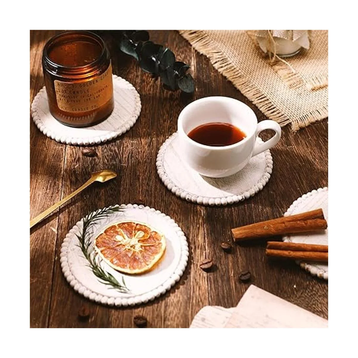 Diseño vintage: los bonitos posavasos para bebidas están diseñados en forma redonda, clásico y atractivo, y decorados con cuentas de madera, haciendo que estos posavasos estén llenos de sensación fiable y rústica, lo que te aporta una sensación de comodidad