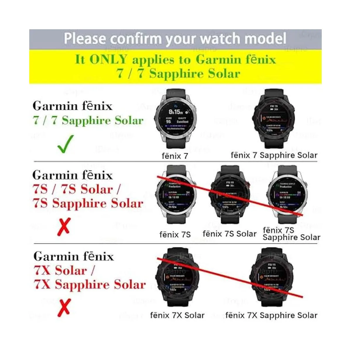 Compatible con Garmin fenix 7 / 7 Sapphire Solar solamente, no es compatible con Fenix 7X Solar/ 7X Sapphire Solar , Fenix 7S/7S Solar/ 7S Sapphire Solar otros relojes. Incluye 4 piezas de vidrio templado con las cosas necesarias y 4 tapones de silicona para el polvo.