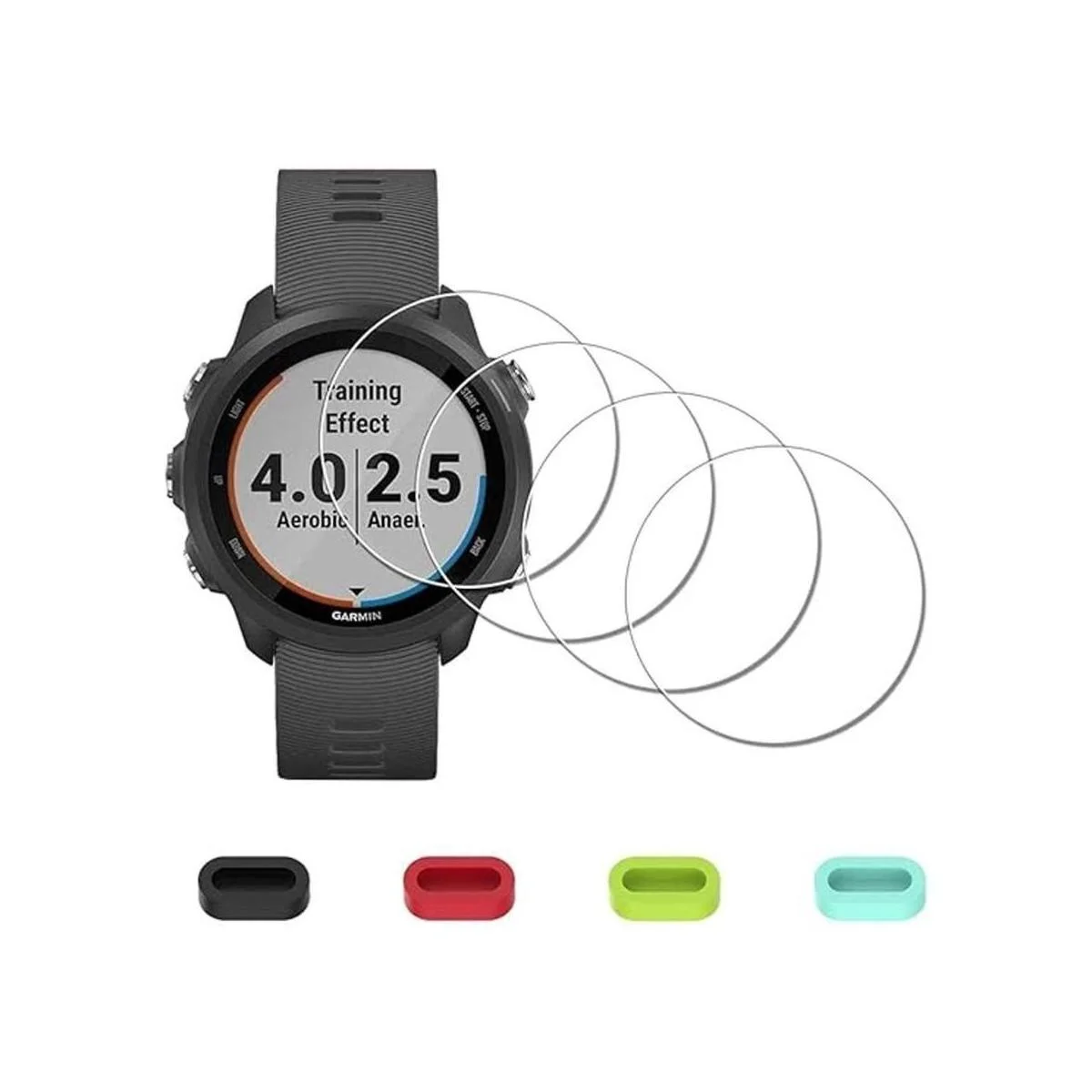 Compatible con Garmin Forerunner 245 Music / 245 Smartwatch solamente, no apto para otros relojes. Incluye 4 piezas de vidrio templado con las cosas necesarias y 4 piezas de tapones antipolvo de silicona.