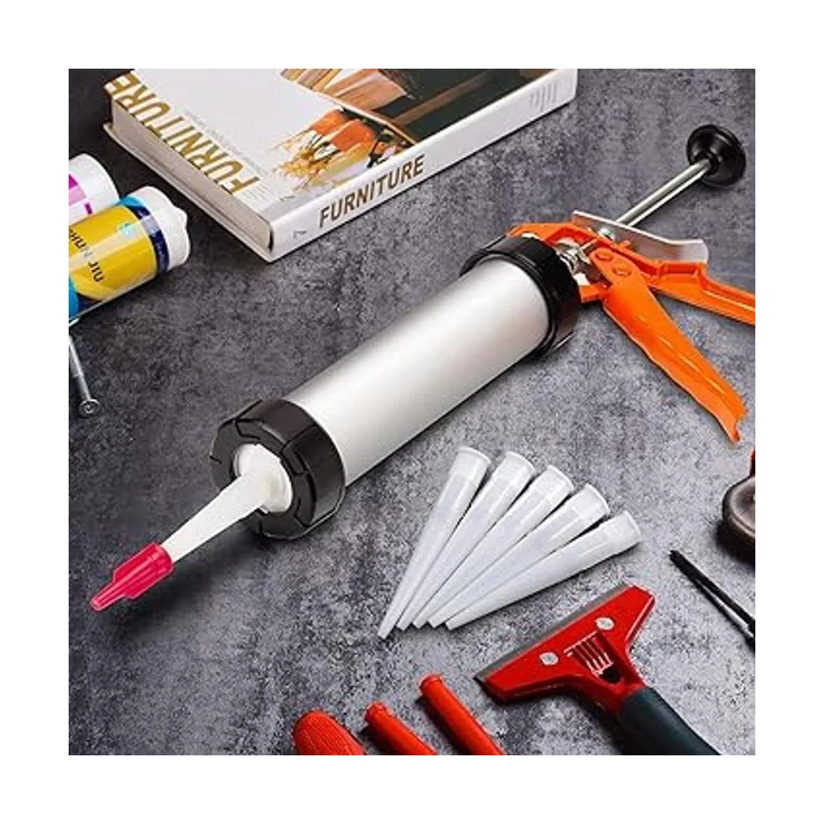 Material: hecho de plástico de calidad, la punta de la boquilla de calafateo es resistente y fiable, no se rompe ni se agrieta fácilmente, con aspecto suave, fácil de limpiar, y puede hacer que el sellador salga suavemente