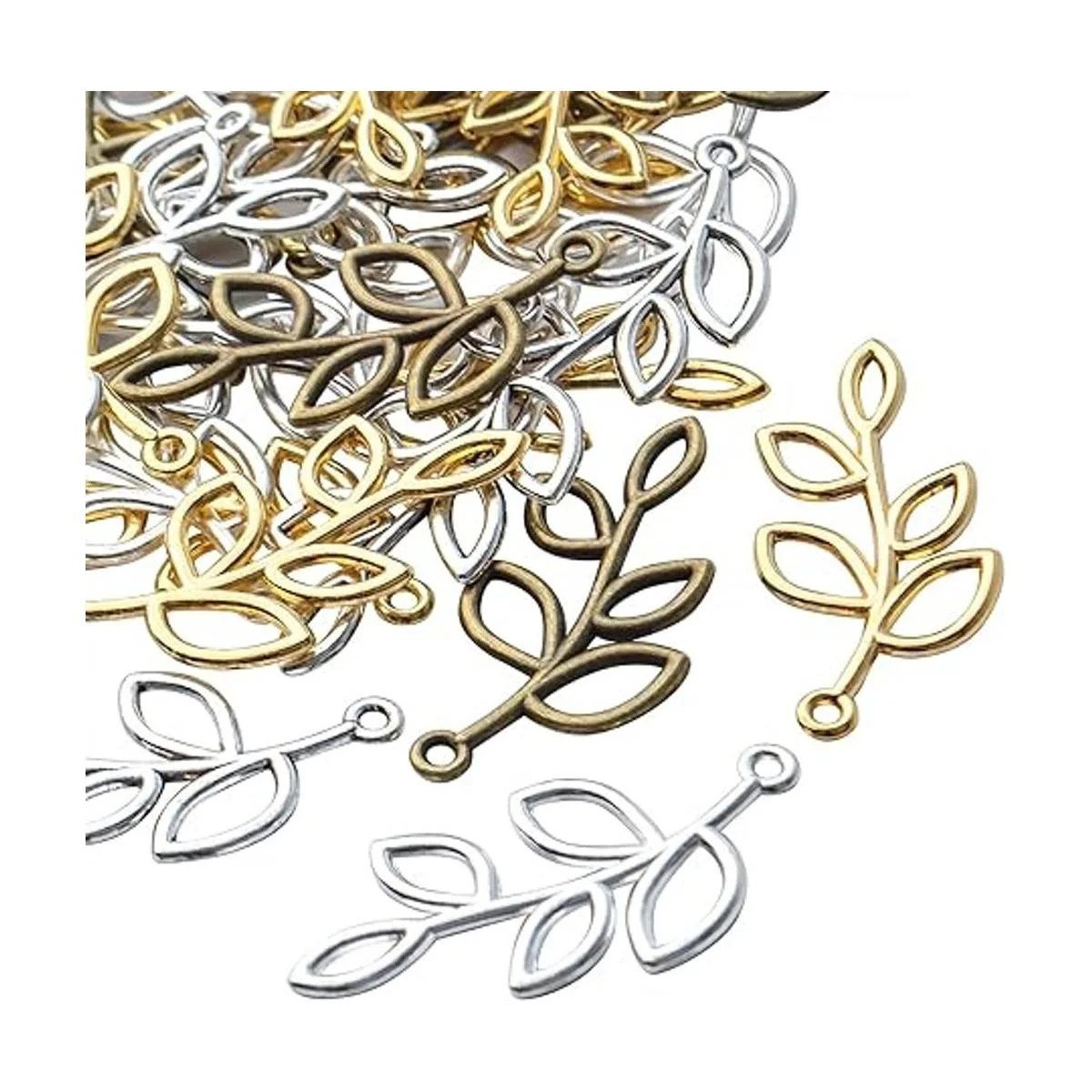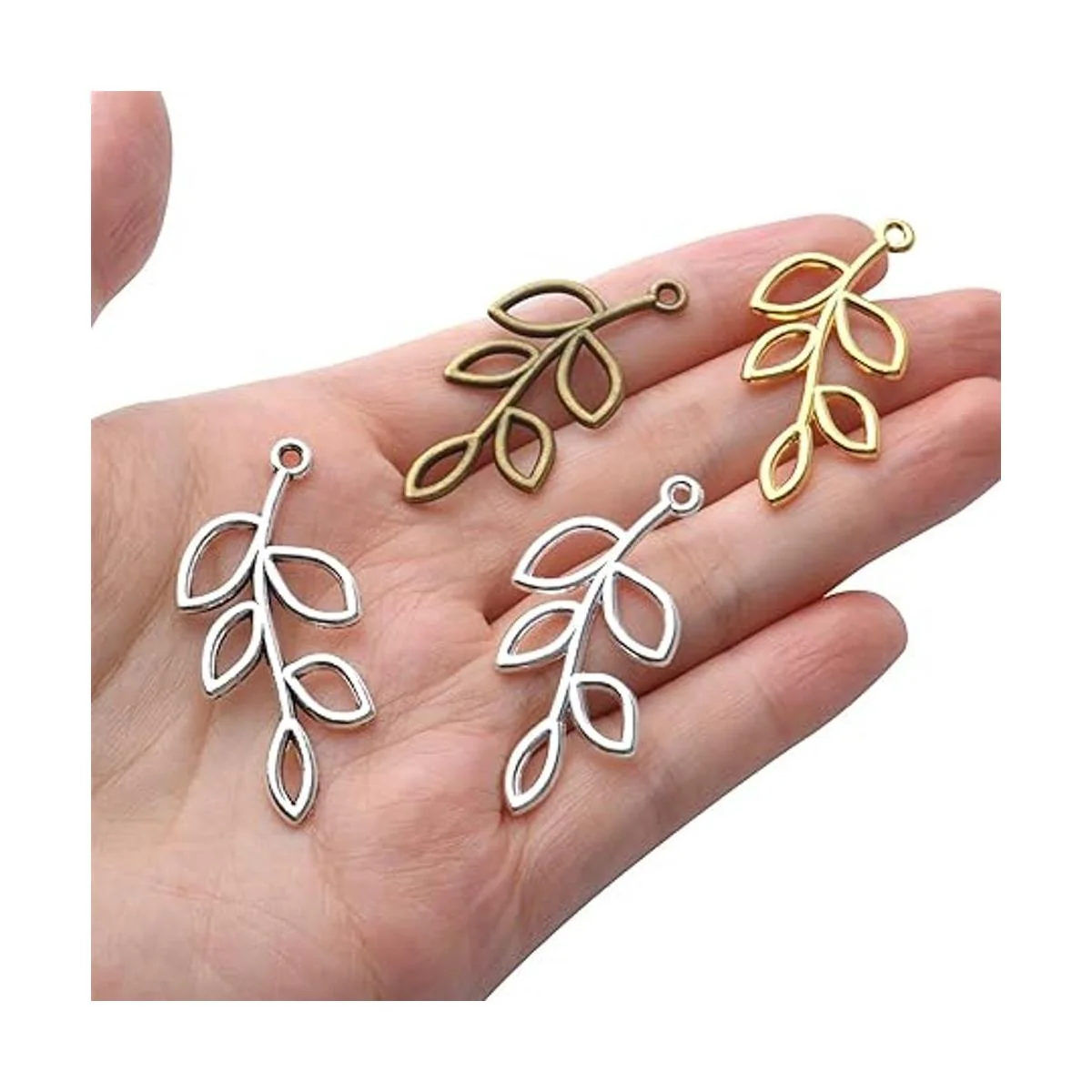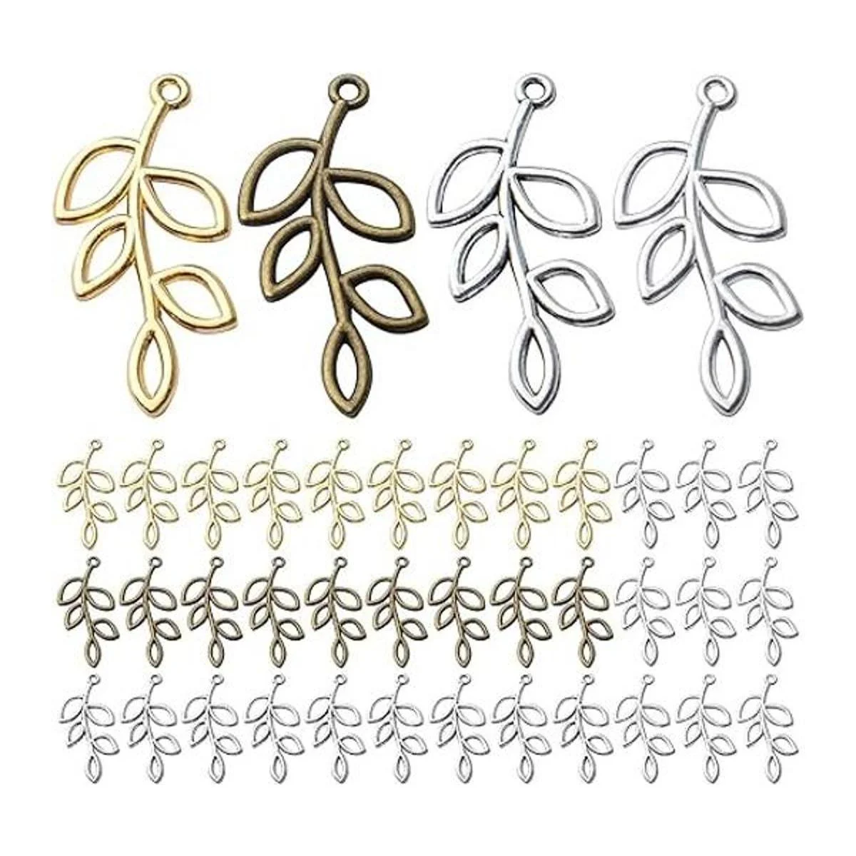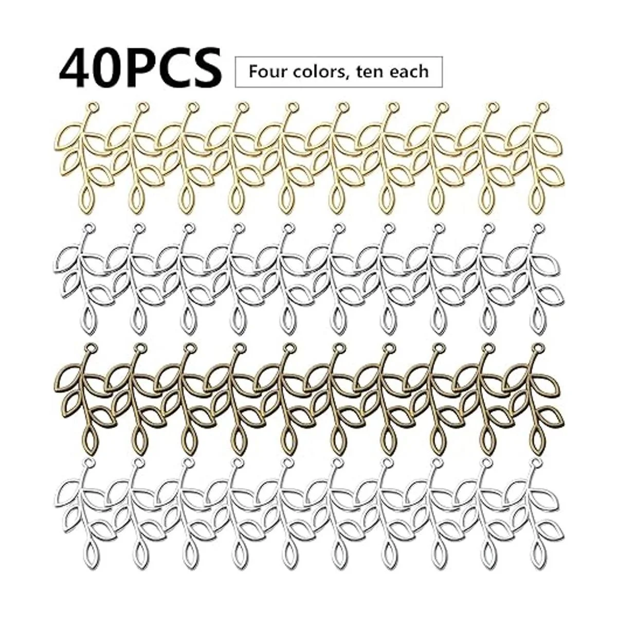 El paquete incluye: 40 abalorios de hoja en el paquete, 4 colores oro, plata antigua, bronce antiguo y plata brillante, 10 unidades de cada color. Puedes utilizar estos abalorios para crear tu estilo favorito.