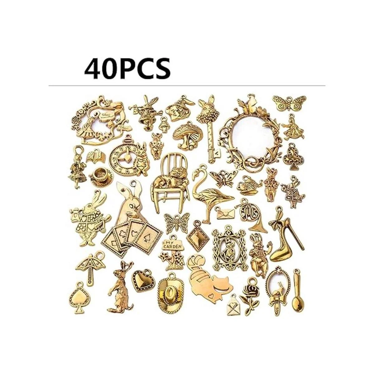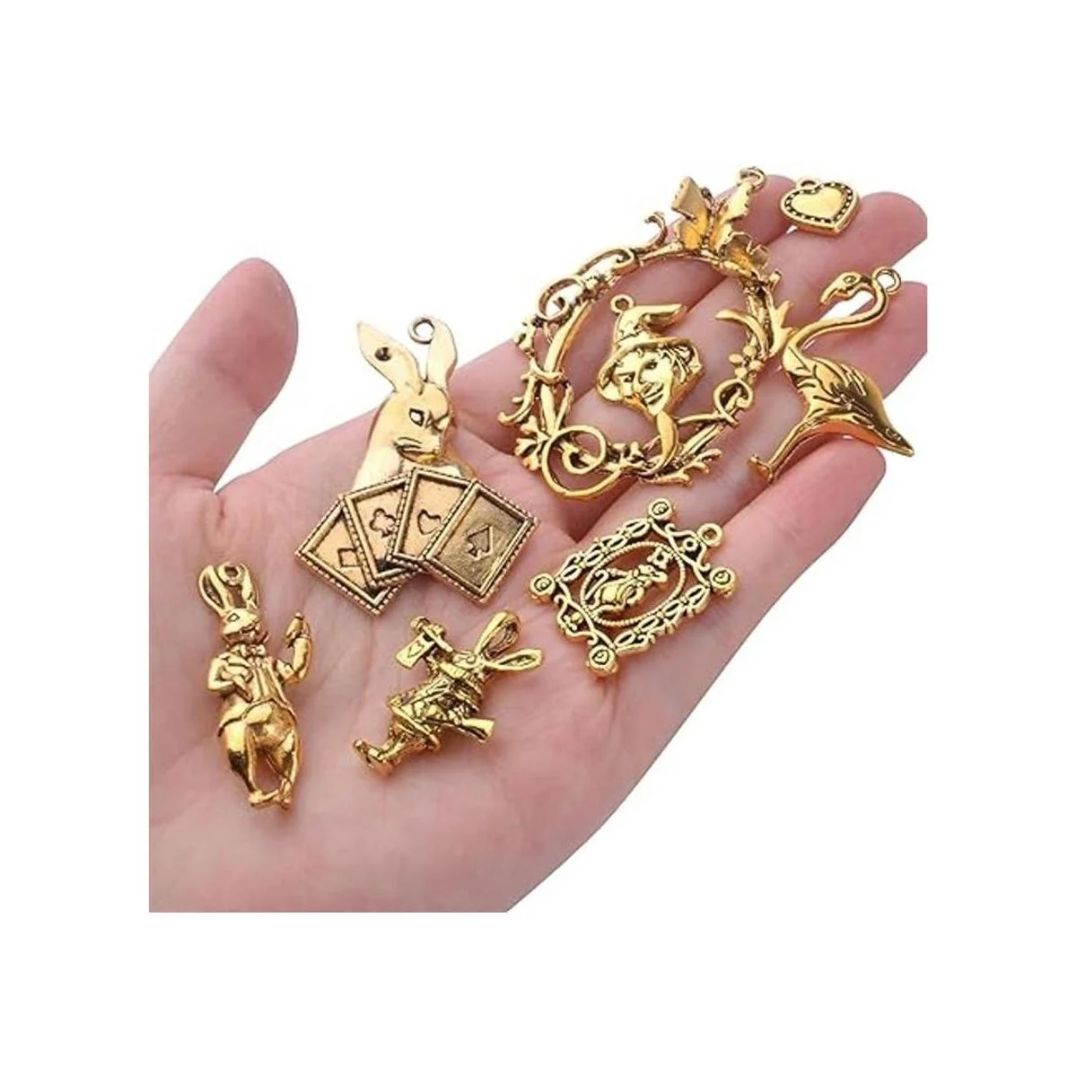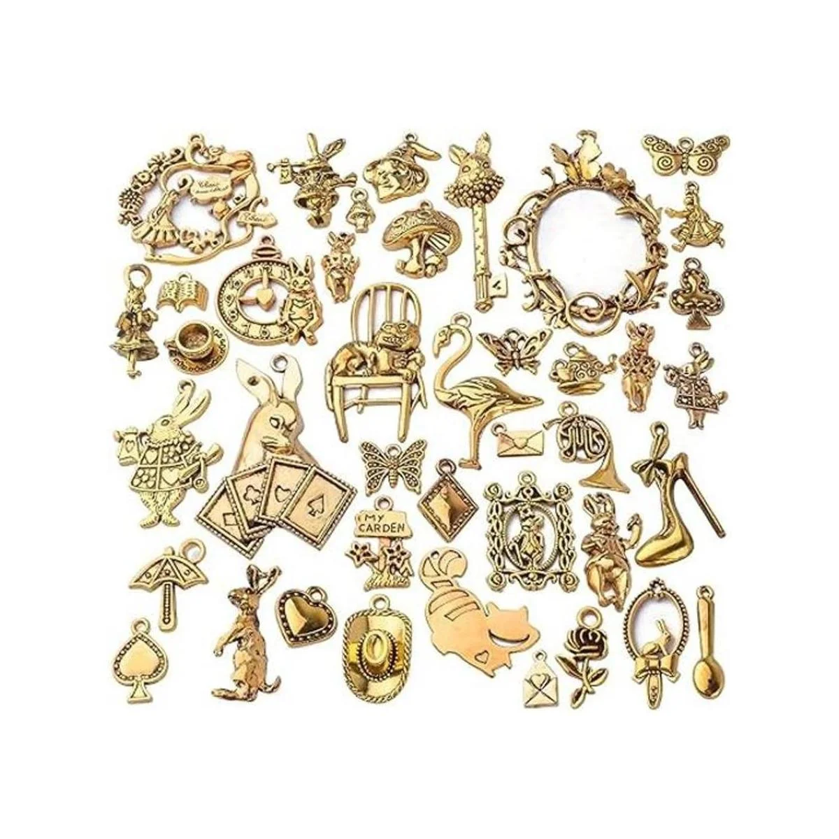 40 dijes de Alicia en el país de las maravillas con cuentos dorados antiguos, para fiesta de té, conejo, reloj steampunk, llaves de esqueleto, dijes, collares, dijes para manualidades, pulseras, joyería