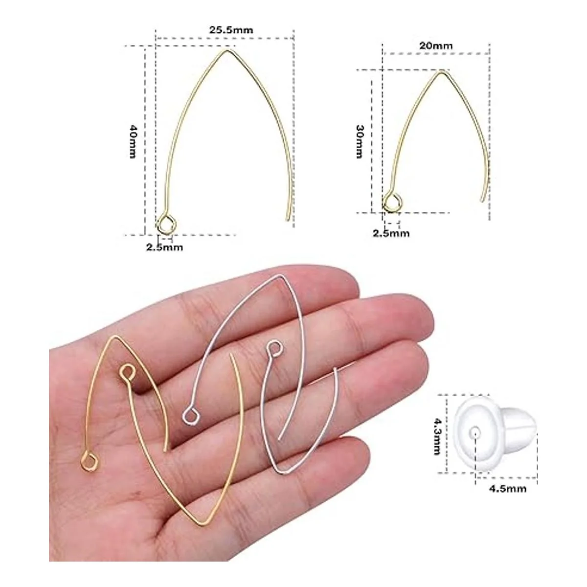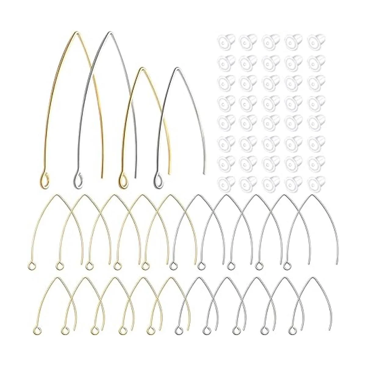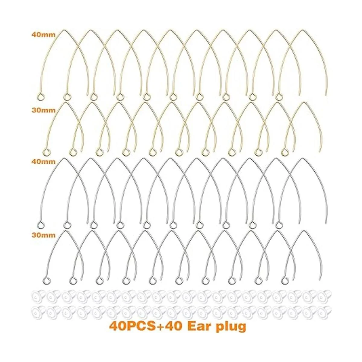 40 ganchos de acero inoxidable en forma de V, hipoalergénicos, conectores de alambre de oreja francesa y 40 piezas de silicona transparente para hacer joyas, decoración hecha a mano, 2 tamaños