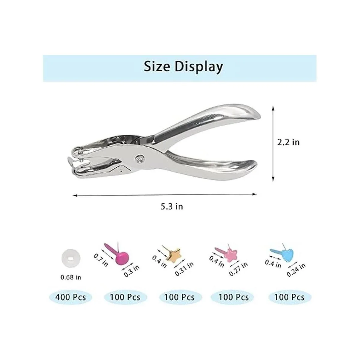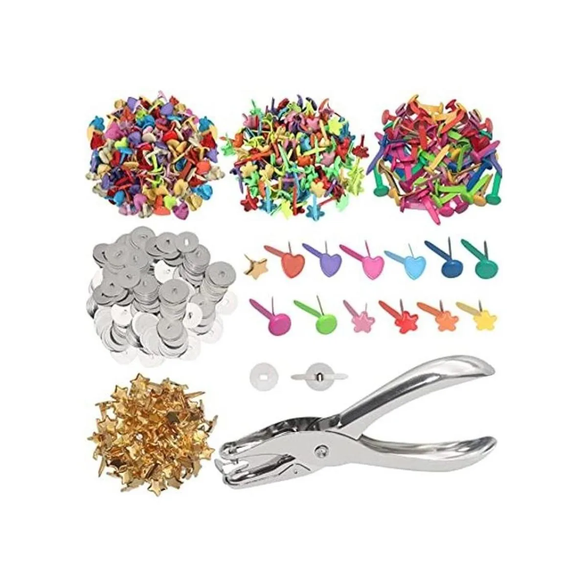 Cierres de papel para manualidades: los sujetadores de papel contienen 4 formas diferentes de mini clavos, hay 100 tachuelas redondas pequeñas, 100 tachuelas pequeñas de flores, 100 tachuelas de metal dorado de cinco puntas, 100 tachuelas de metal de corazón de amor, más 400 arandelas de latón chapado y un perforador.