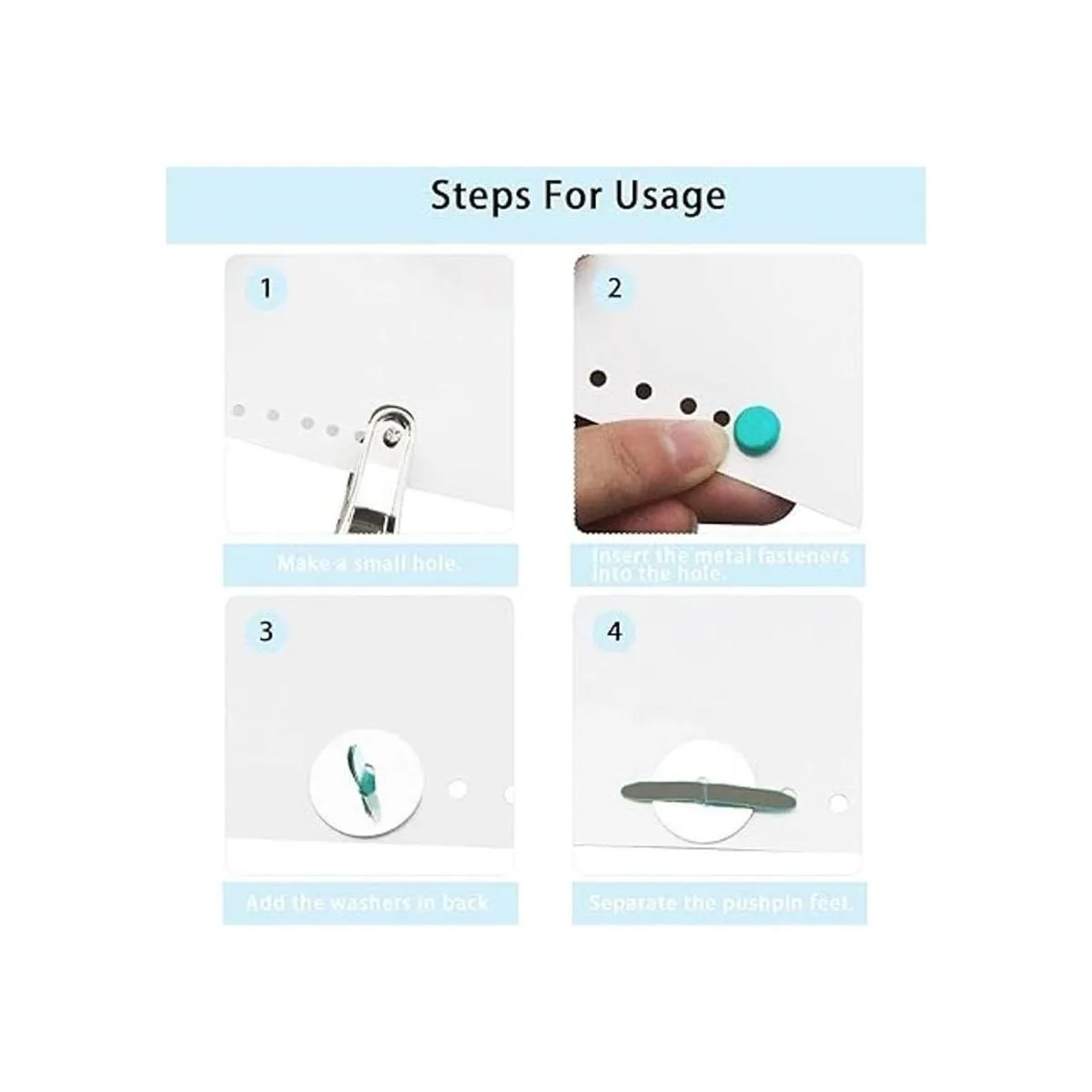 Fácil de aplicar: simplemente utiliza un perforador de un solo agujero para perforar un agujero en el lugar donde necesitas instalar, y elige tus clavos redondos favoritos de metal para pasar a través del papel, luego inserta la arandela en la parte posterior de los sujetadores de sujetadores, finalmente separa los 2 pies de los cierres de clavos.