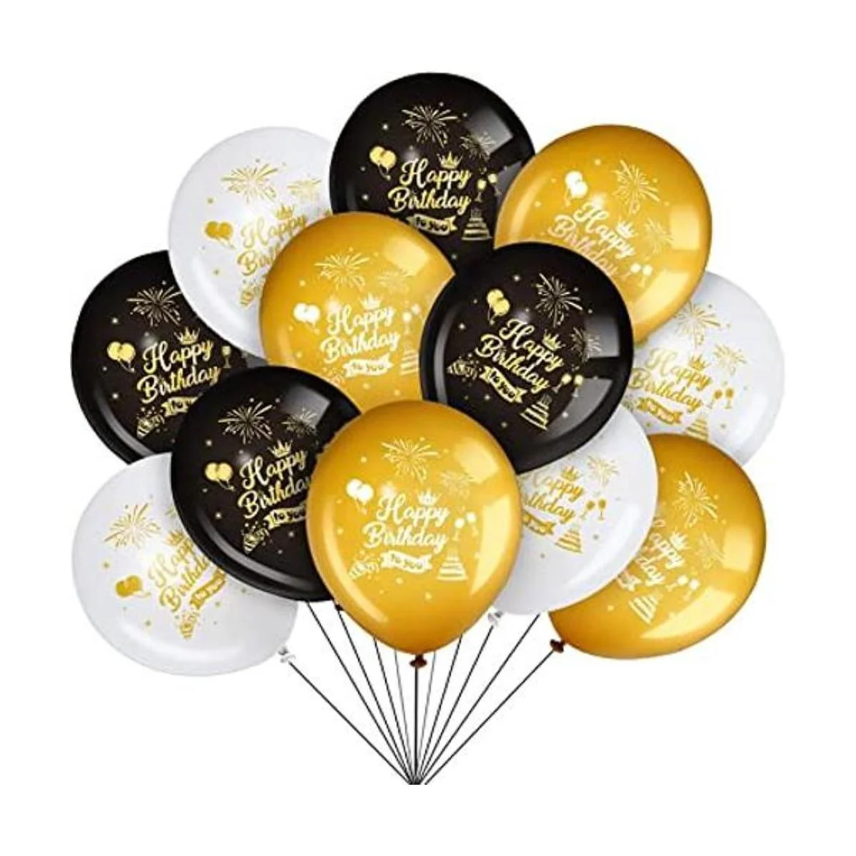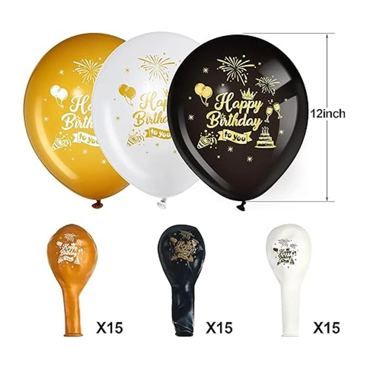 3 diseños de colores: los globos de látex de estilo cumpleaños vienen en 3 colores, negro, dorado y blanco, 15 piezas para cada color, con patrones exquisitos, adecuados para suministros de fiesta de cumpleaños; los globos dorados, negros y blancos añadirán un toque a tu decoración de cumpleaños, crearán un ambiente alegre y te dejarán a ti y a tus invitados de fiesta un recuerdo inolvidable