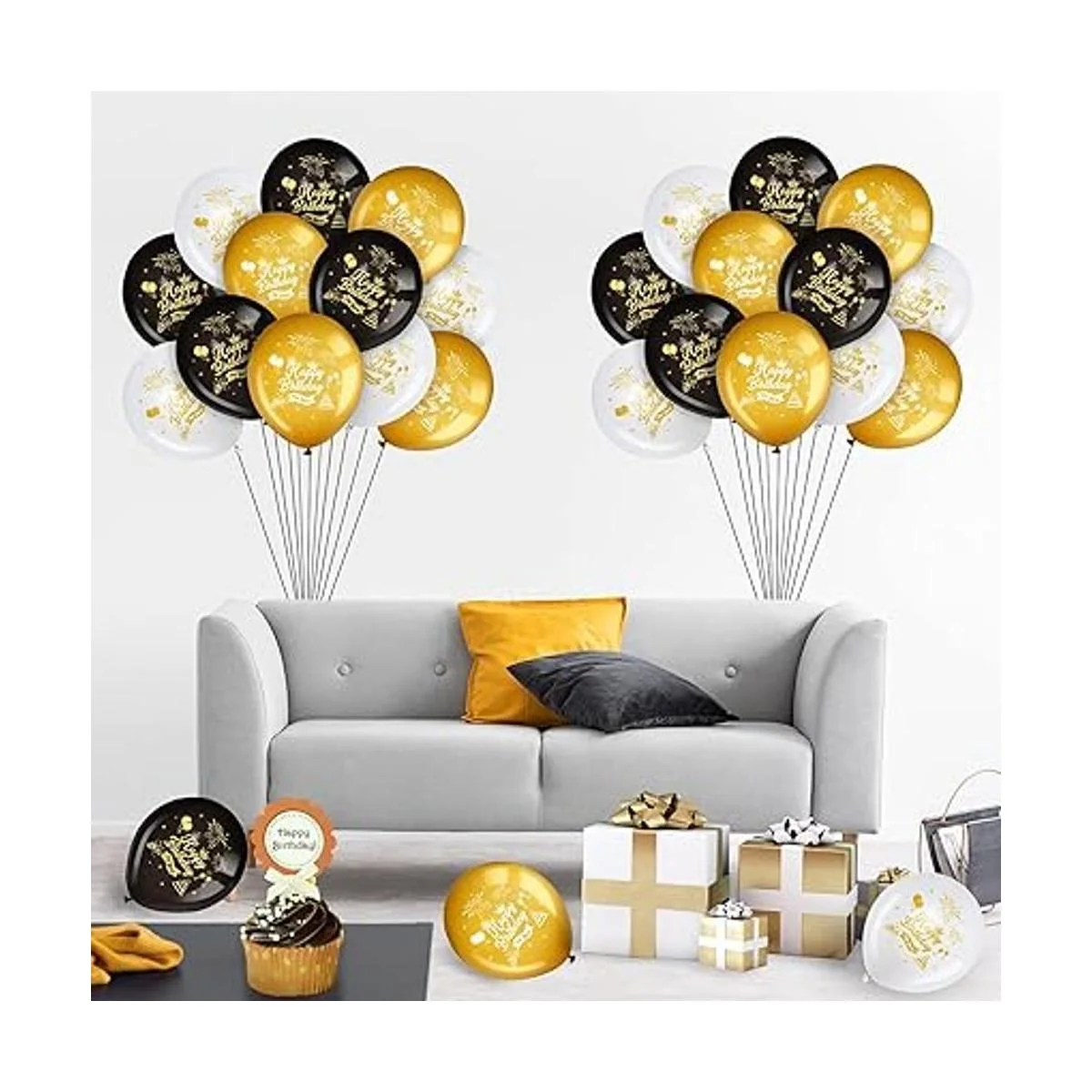 Decoración de cumpleaños para interiores y exteriores: los globos de cumpleaños negros y dorados de doble cara son lo suficientemente ligeros como para colgar en el soporte, valla, árbol, pared, puerta de garaje para hacer un llamativo efecto decorativo; combinando con otros accesorios y decoraciones de fiesta, los globos de cumpleaños serán un éxito en tu fiesta de cumpleaños