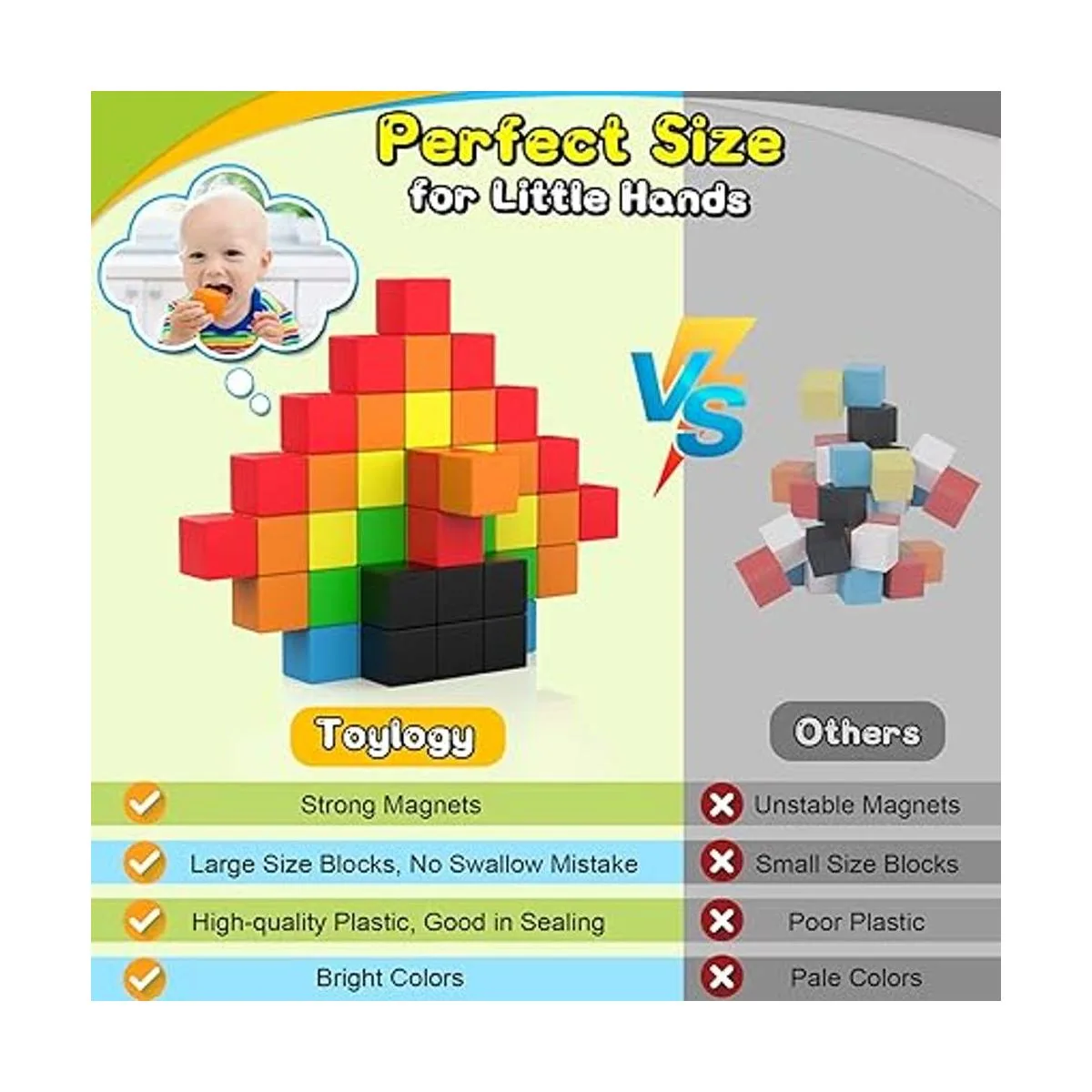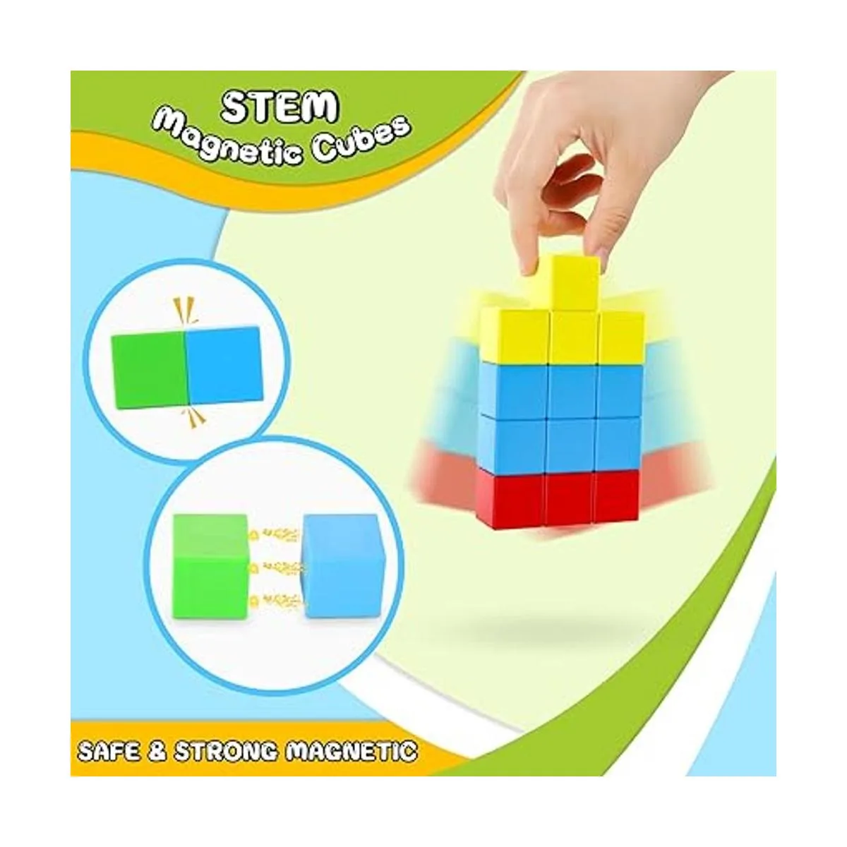 Imán seguro y fuerte Los cubos magnéticos de actividad Toylogy están hechos de material ABS de alta calidad y fabricados con los bordes redondos y el tamaño correcto, tampoco hay riesgo de errores de tragación. En comparación con las bolas magnéticas en el mercado, nuestro imán más fuerte está sellado dentro de la caja de plástico totalmente para evitar que el imán se caiga. Muy recomendable para niños de 3 a 5 años.