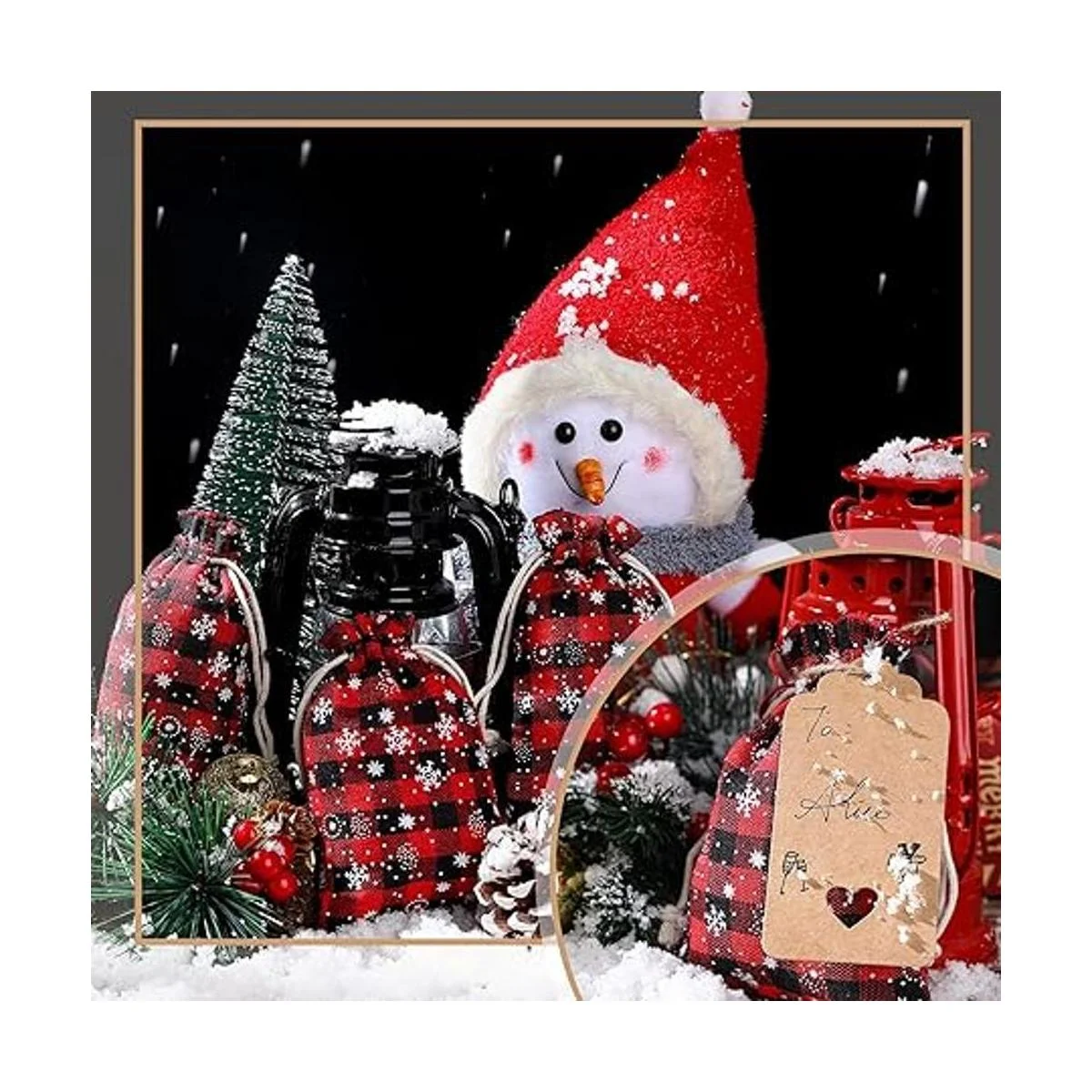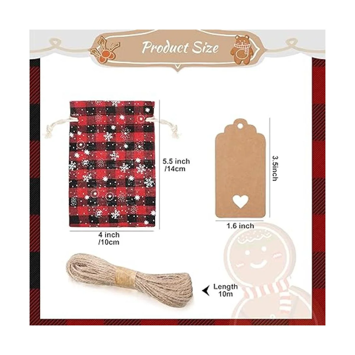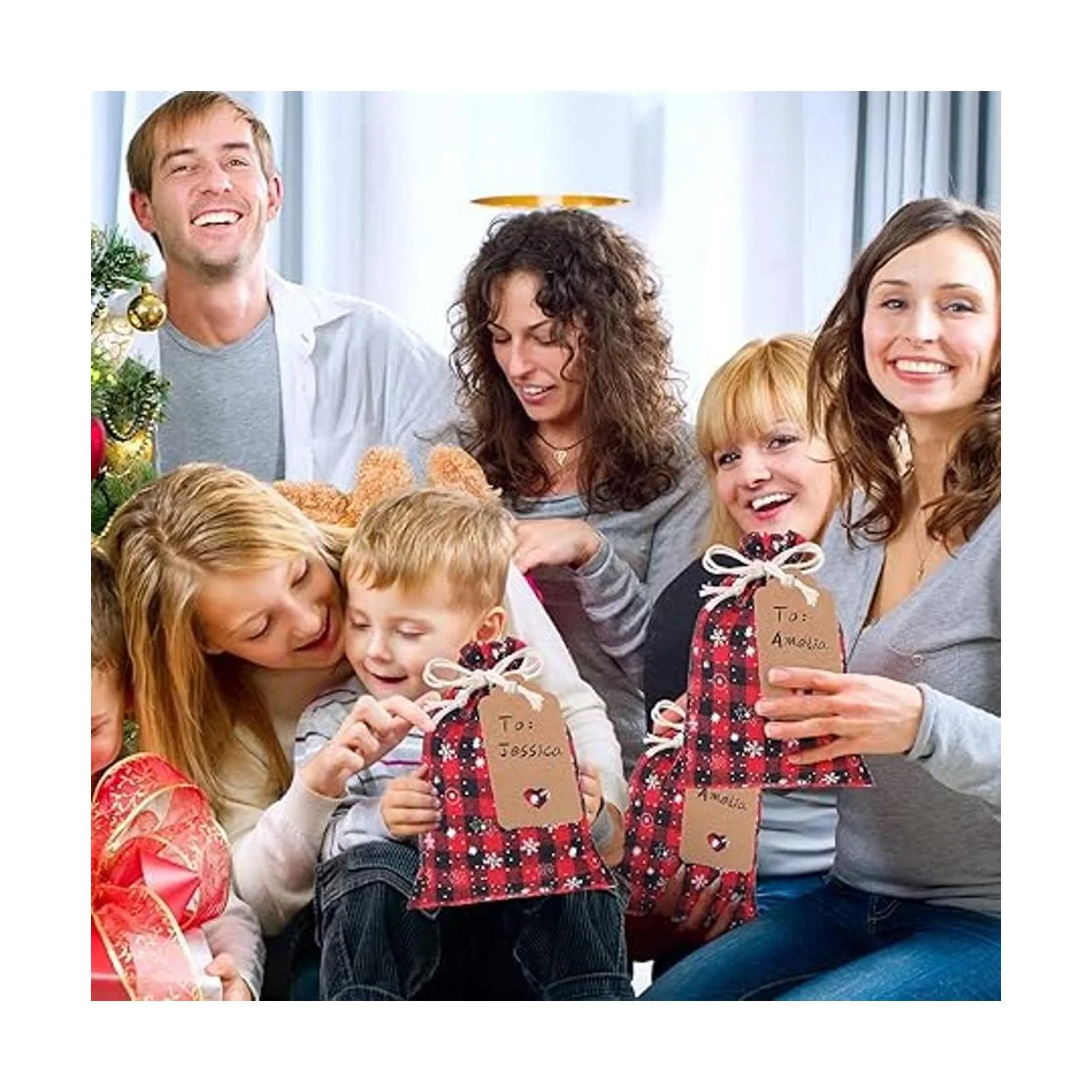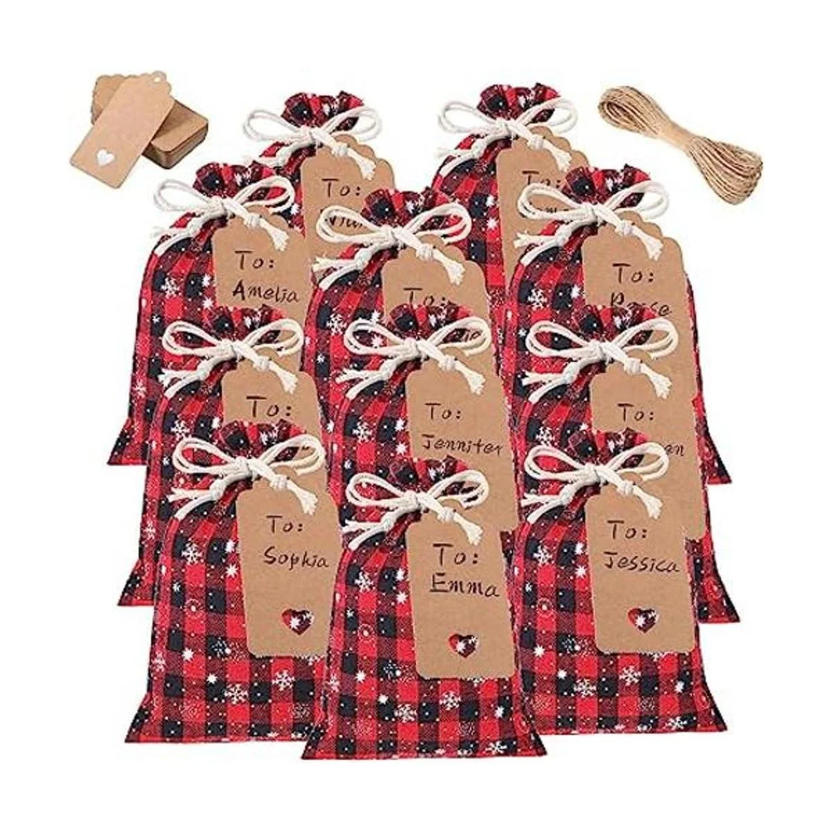 48 bolsas de Navidad con cordón, bolsas de arpillera a cuadros de Navidad, bolsas de dulces de lino, bolsas de regalo de fiesta, bolsa de Navidad con tarjetas y cuerda negro, rojo, 6 x 4 pulgadas