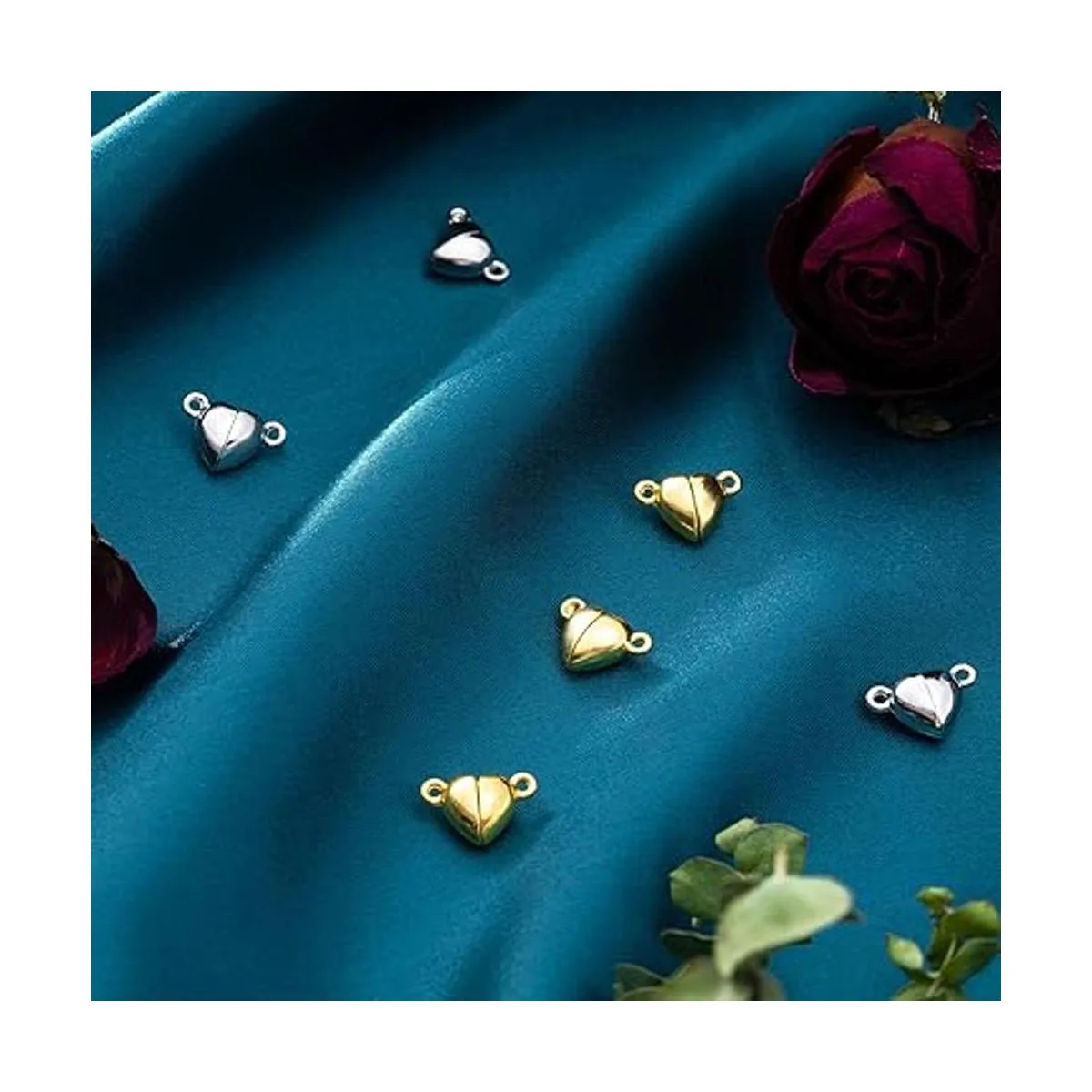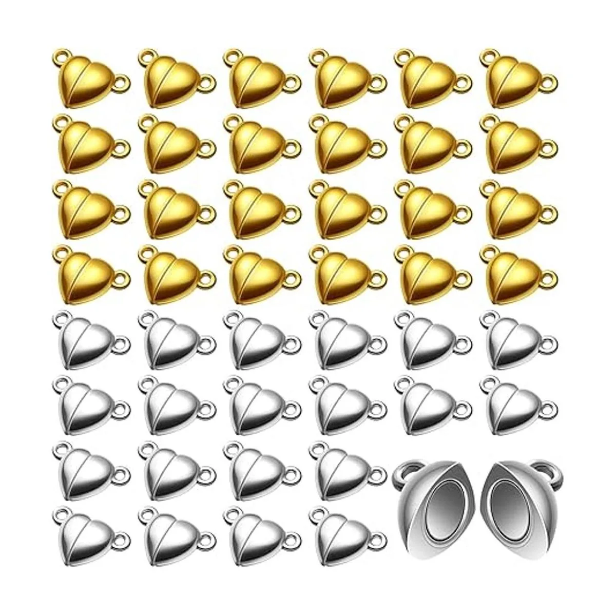 Cierres magnéticos para hacer joyas: recibirás 48 cierres magnéticos en forma de corazón en oro y plata, 24 piezas de cada color, suficientes para que puedas hacerlo tú mismo y dar a tus piezas un acabado profesional