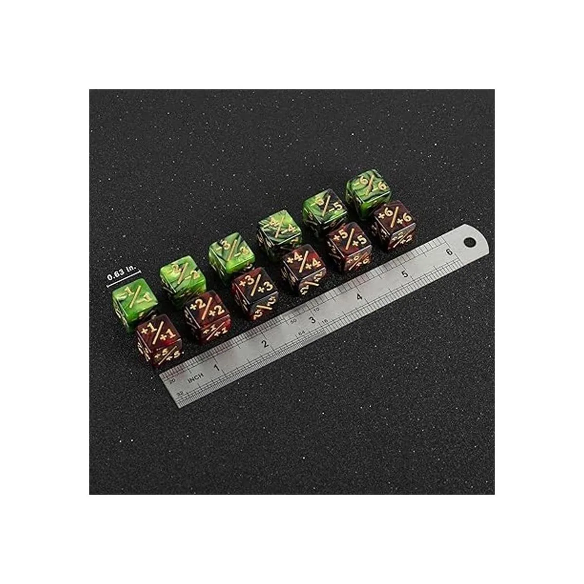Contenido del paquete: 48 contadores de dados con 2 bolsas de franela. Incluye 24 piezas 16 contadores de dados de rubí y 24 piezas 16 contadores de dados de esmeralda. Son dados D6 regulares de 0.630 in.