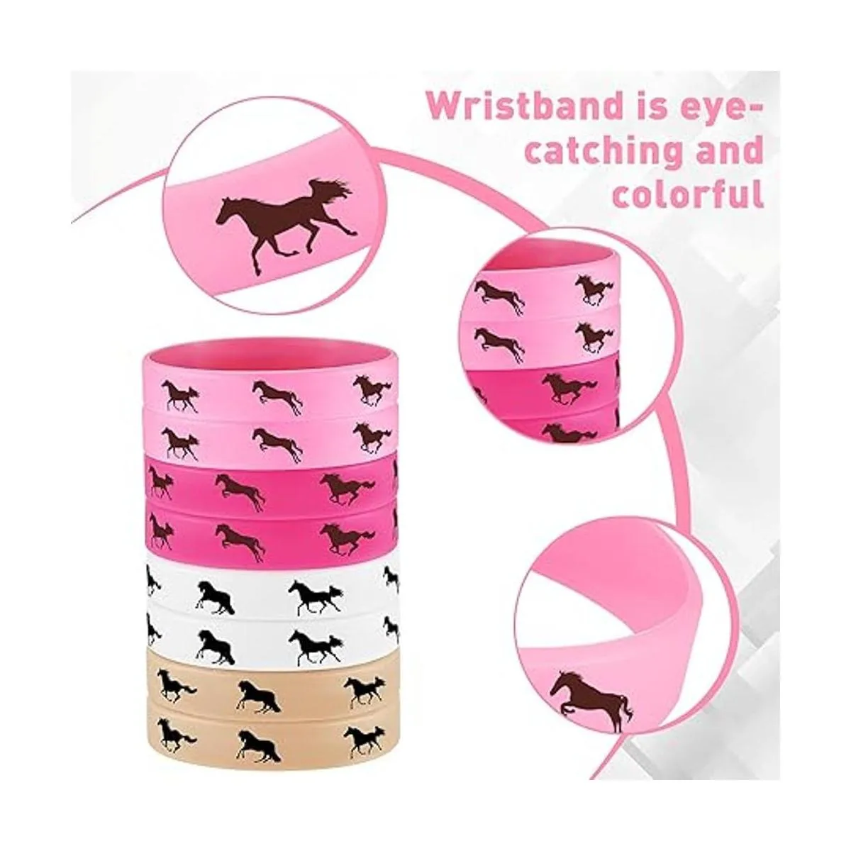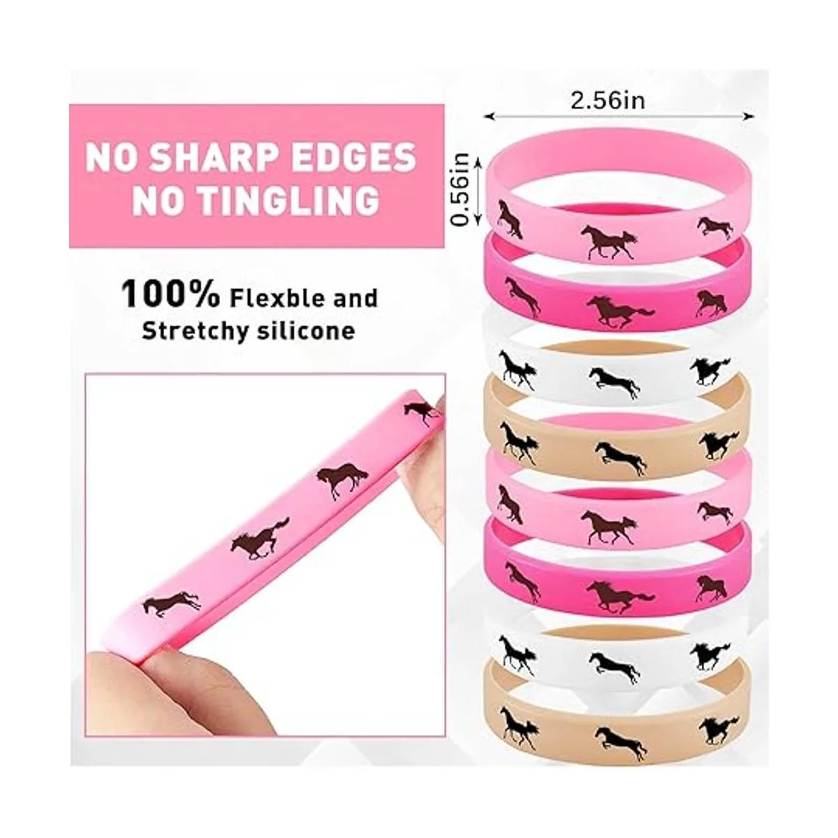 Calidad fiable: estas pulseras de goma para caballos están hechas de silicona de calidad, material fiable, suave y cómodo al tacto, sin borde puntiagudo que te dañe, no te picará cuando lo lleves, difícil de romper o deformar, sin decoloración del color, sin olor extraño, no es fácil de llevar ni rasgar, lo que te proporciona un servicio a largo plazo