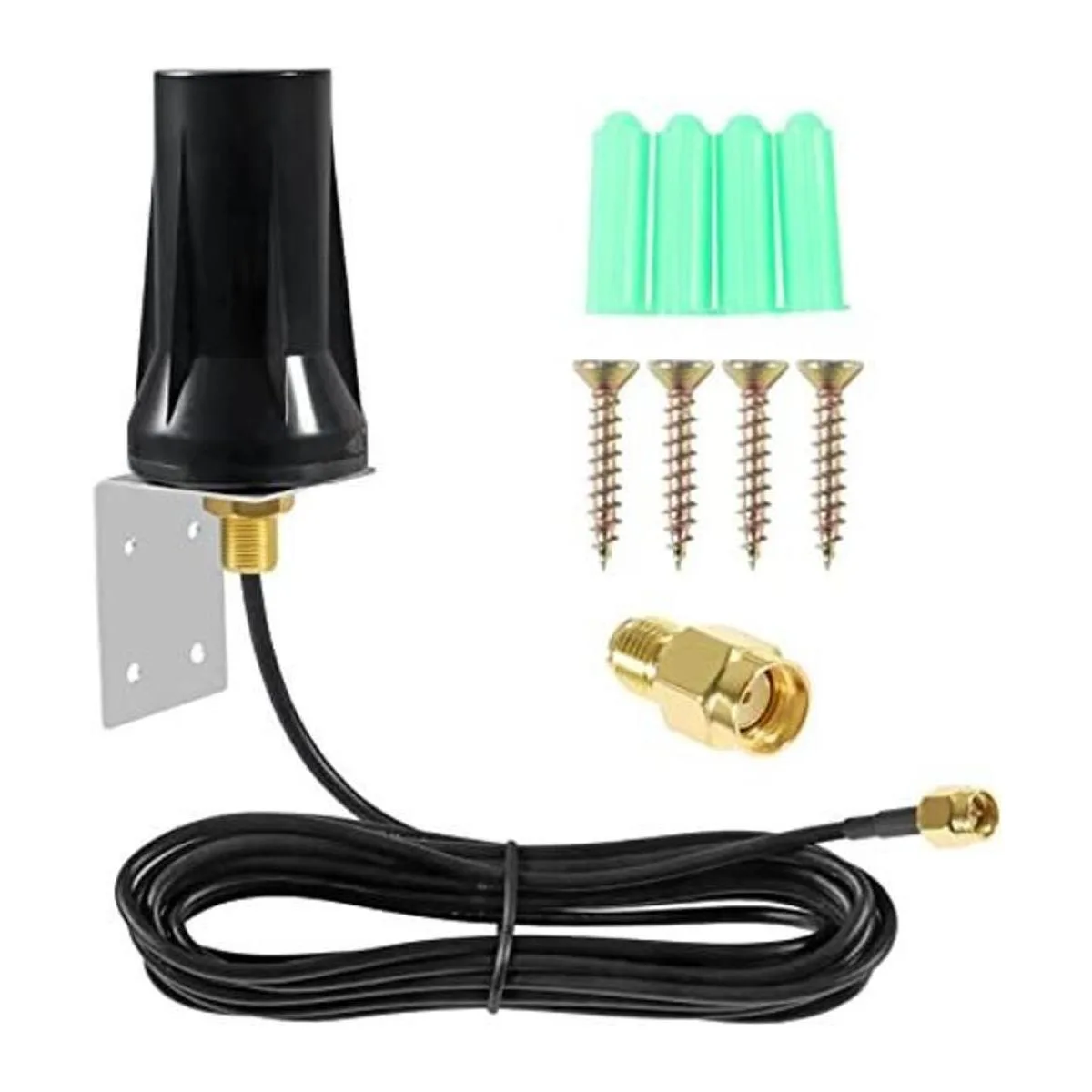 Rango de frecuencia: 698960 MHz, 17102170 MHz, 23002700 MHz; Ganancia: 5 dBi; omnidireccional; impermeable: a prueba de lluvia; Característica: montaje de pared fijo; montaje de agujero pasante; 9.8 ft de baja pérdida KSR 195 cable coaxial; conector macho RSMA Adaptador macho PSMA ter;