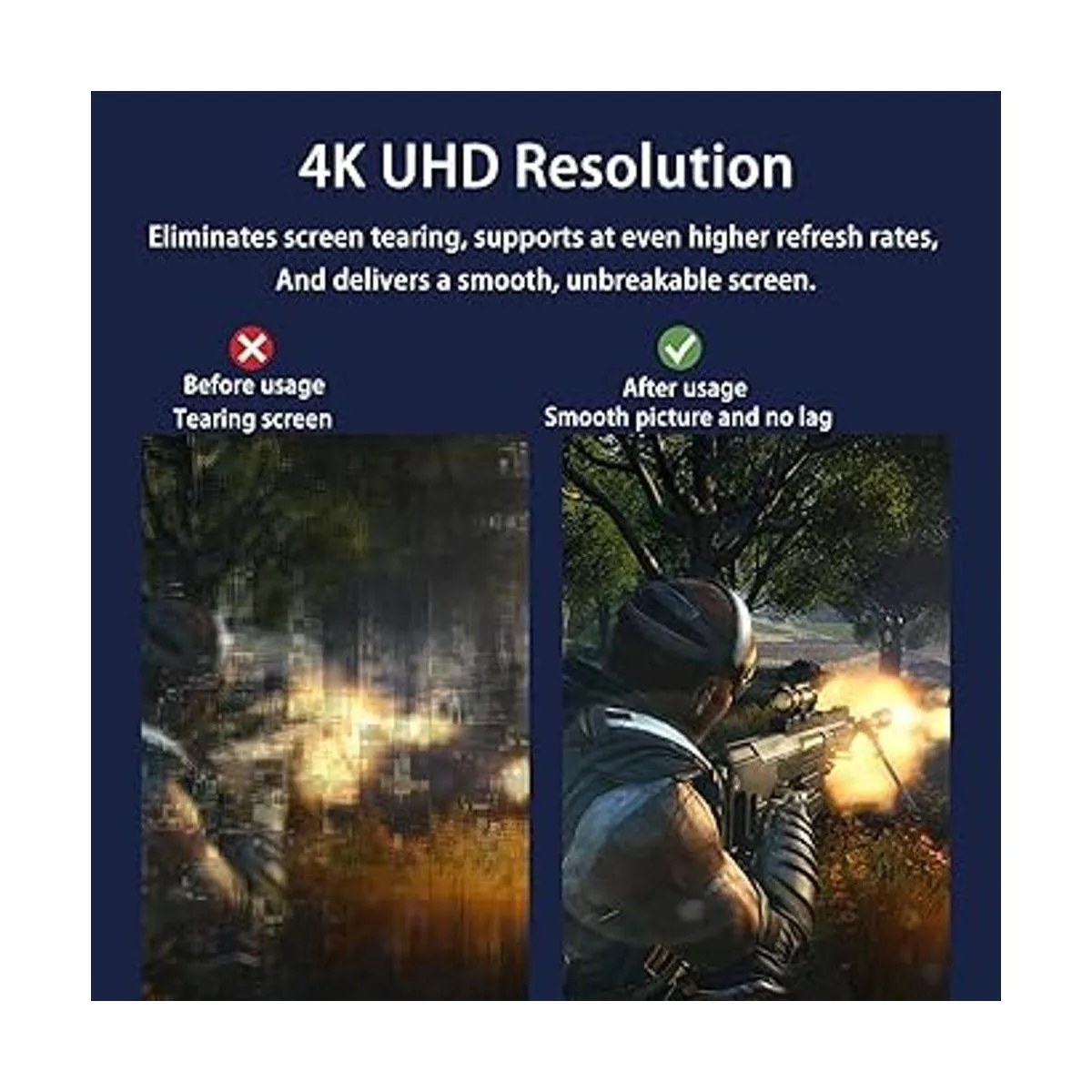 4K UHD Resolution The Cable offers 4K resolutions at 30Hz, backward compatible with 2K60hz, 1080P120hz, which allows you to enjoy realistic images as if you were in a movie theater. It also supports 3Denabled multiapplications, eliminates screen tearing and at even higher refresh rates, and delivers a smooth, unbreakable screen.
