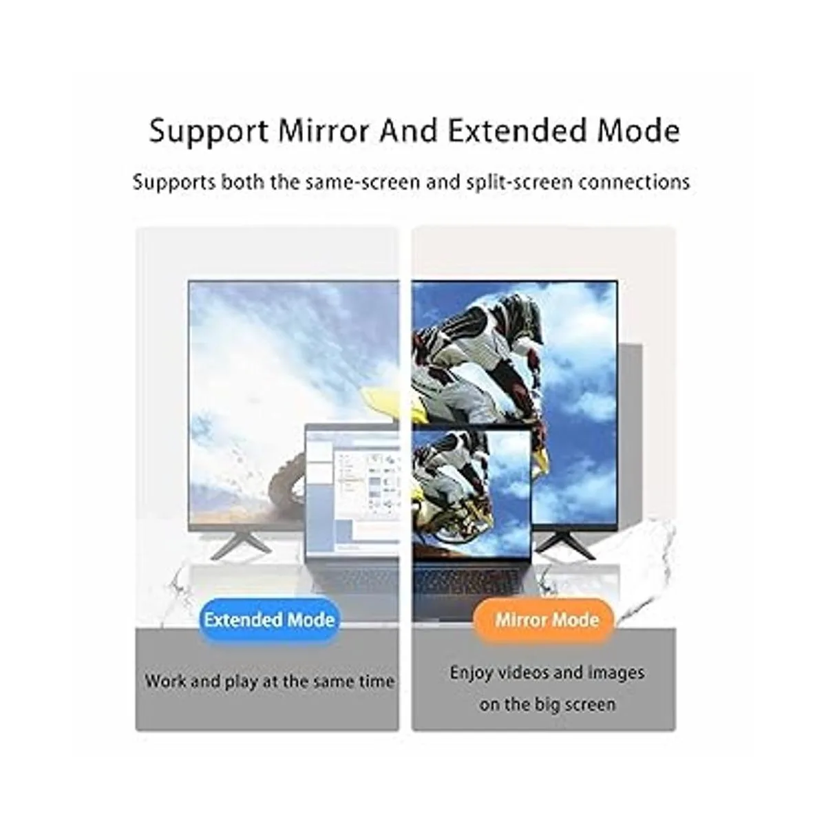 Support Mirror Extended Mode The Cable supports Mirror Mode, which you could cast the screen and images from your computer to HDTV or Projector; Meanwhile offters Extended Mode, which you could build a multidisplay environment; And also supports audio transmission with uncompressed digital 7.1, 5.1 or 2 audio channels.
