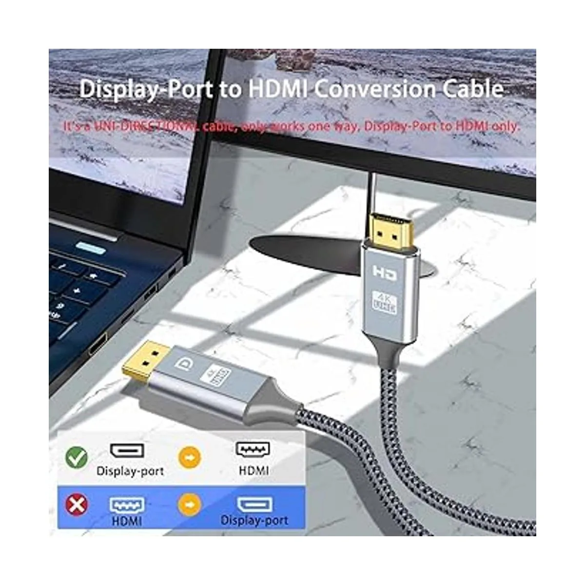Unidirectional DisplayPort to HDMI The Pizucb DPHDMI cable is used to connect a source device equipped with Display port for example, a PC, Graphic Card etc. to a Monitor, HDTV, or Projector that has an HDMI port. It is a Passive cable, not Active. Please note: Its a UNIDIRECTIONAL cable, only works one way, Display Port to HDMI only. If you try to connect HDMI to display port, it wont work.