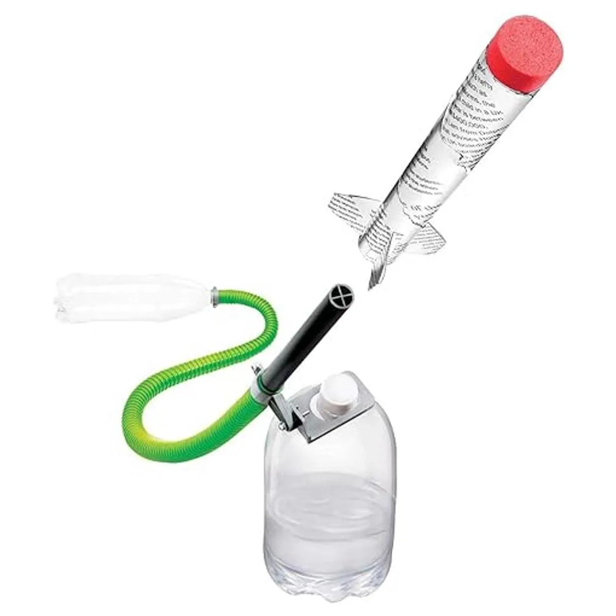 El kit incluye todas las piezas necesarias para construir dos 2 cohetes ecológicos y un sistema de lanzamiento. Solo provee botellas de gaseosa recicladas y unas hojas de revistas.