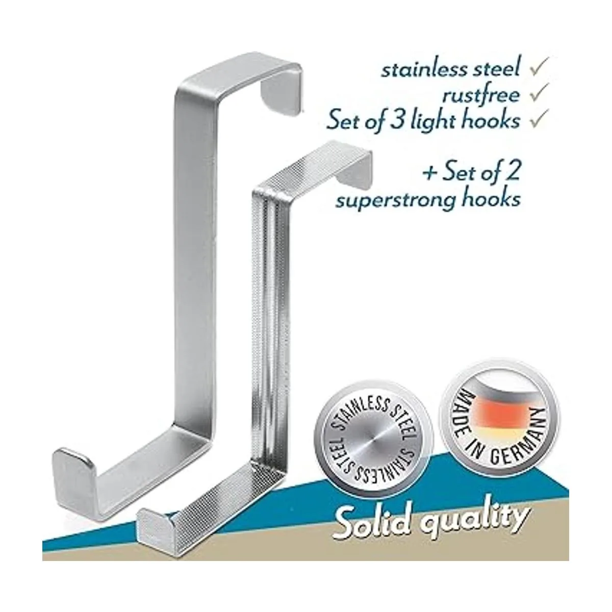 Calidad sólida: para cocina, baño y uso al aire libre. Ganchos de acero inoxidable para puerta de baño fabricados en Alemania y adecuados como toallero de puerta o colgador de toallas de cocina para puerta.