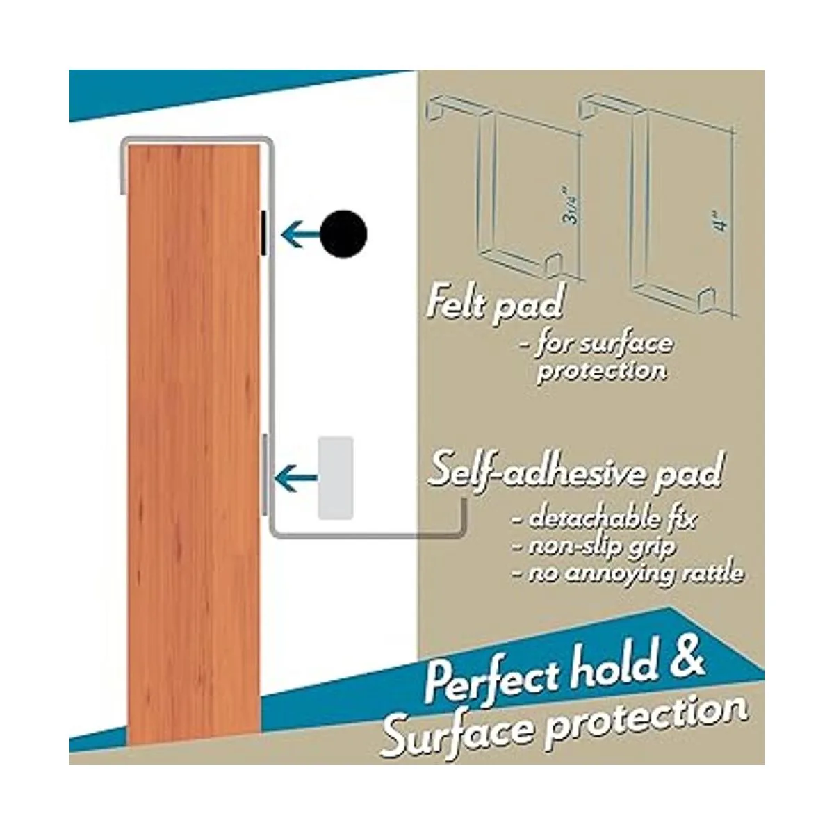Uso de doble cara: dos lados, dos tamaños. Diferentes profundidades de en ambos lados permiten un uso flexible. Los ganchos para colgar ropa o bolsas también se ajustan a puertas de habitación o delantera, incluyendo anchos de puerta de 1 1/2 pulgadas y 1 3/4 pulgadas.