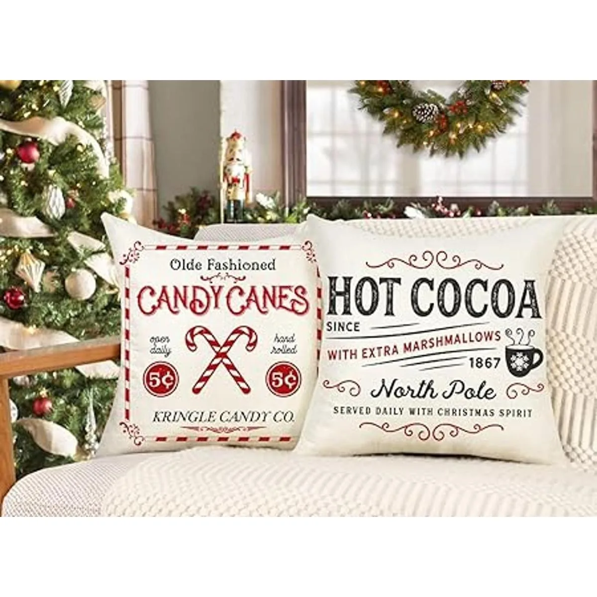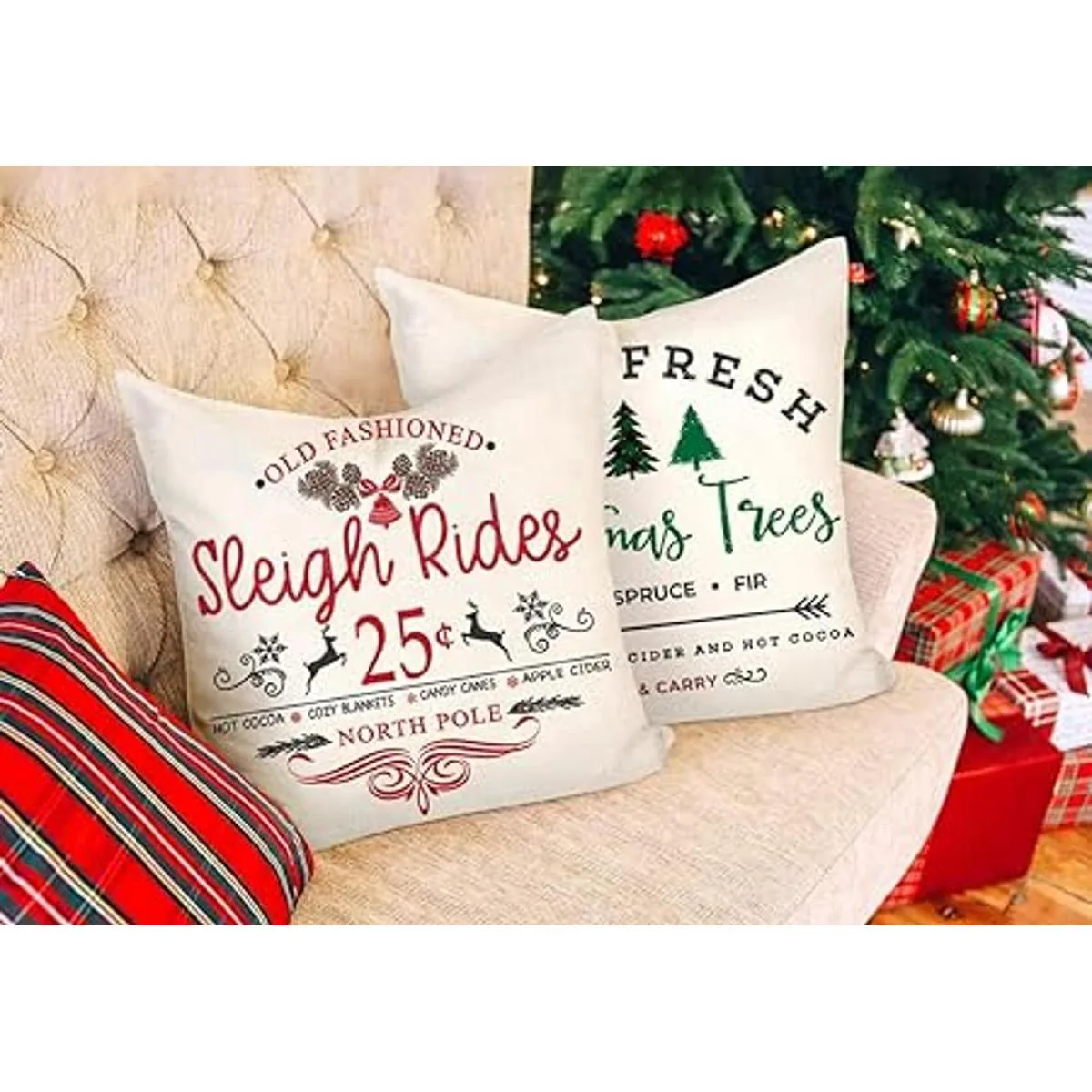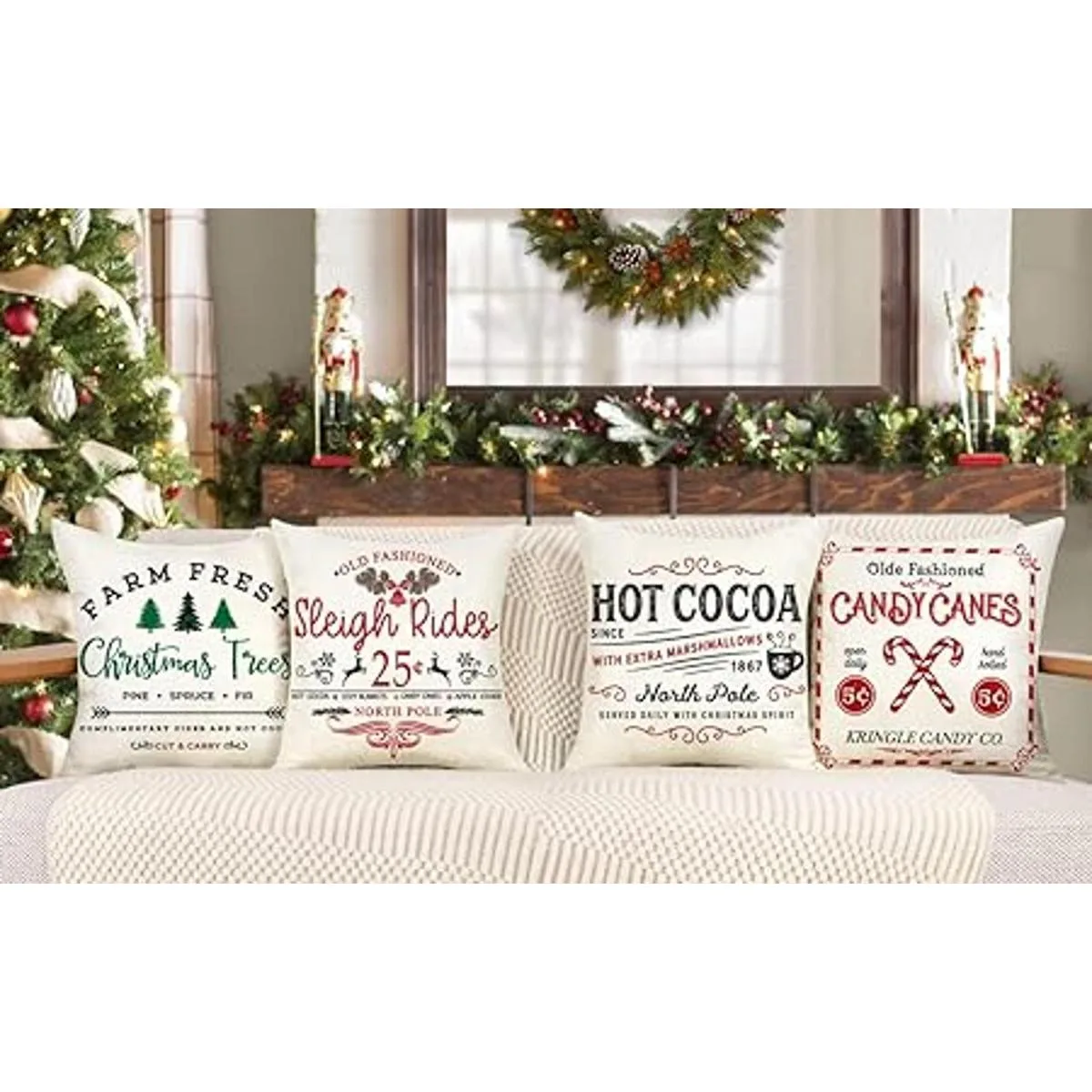 4TH Emotion Juego de 4 fundas de almohada de Navidad de 18 x 18 pulgadas, decoración rústica de invierno, para sofá, decoración del hogar paseos en trineo, árbol fresco de granja, cacao, bastones de caramelo