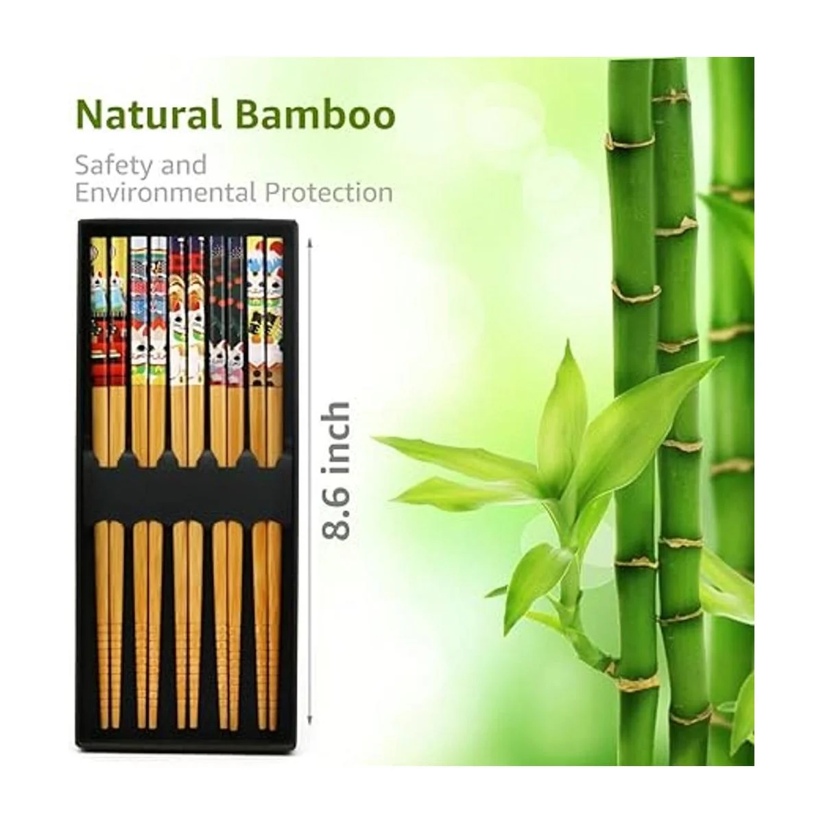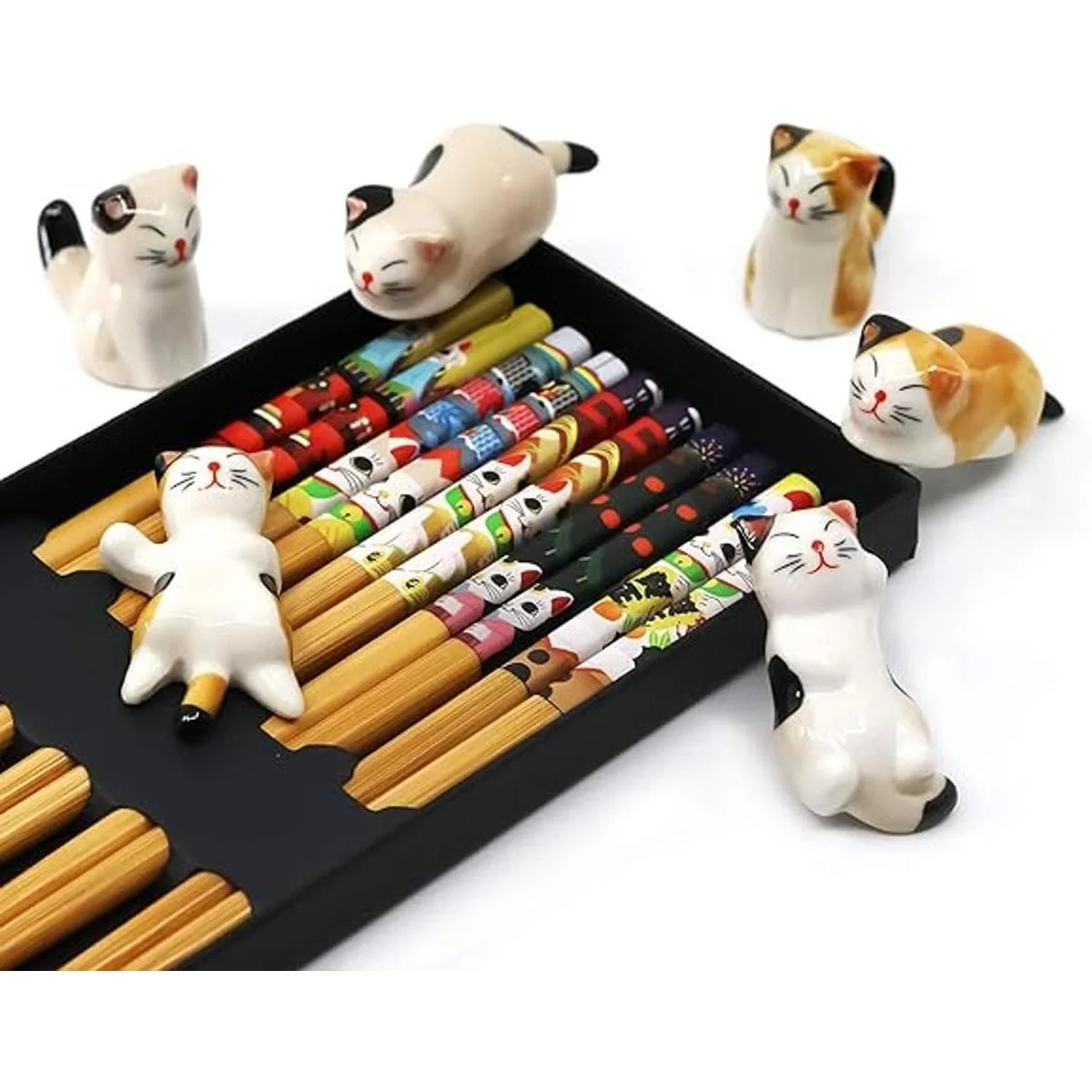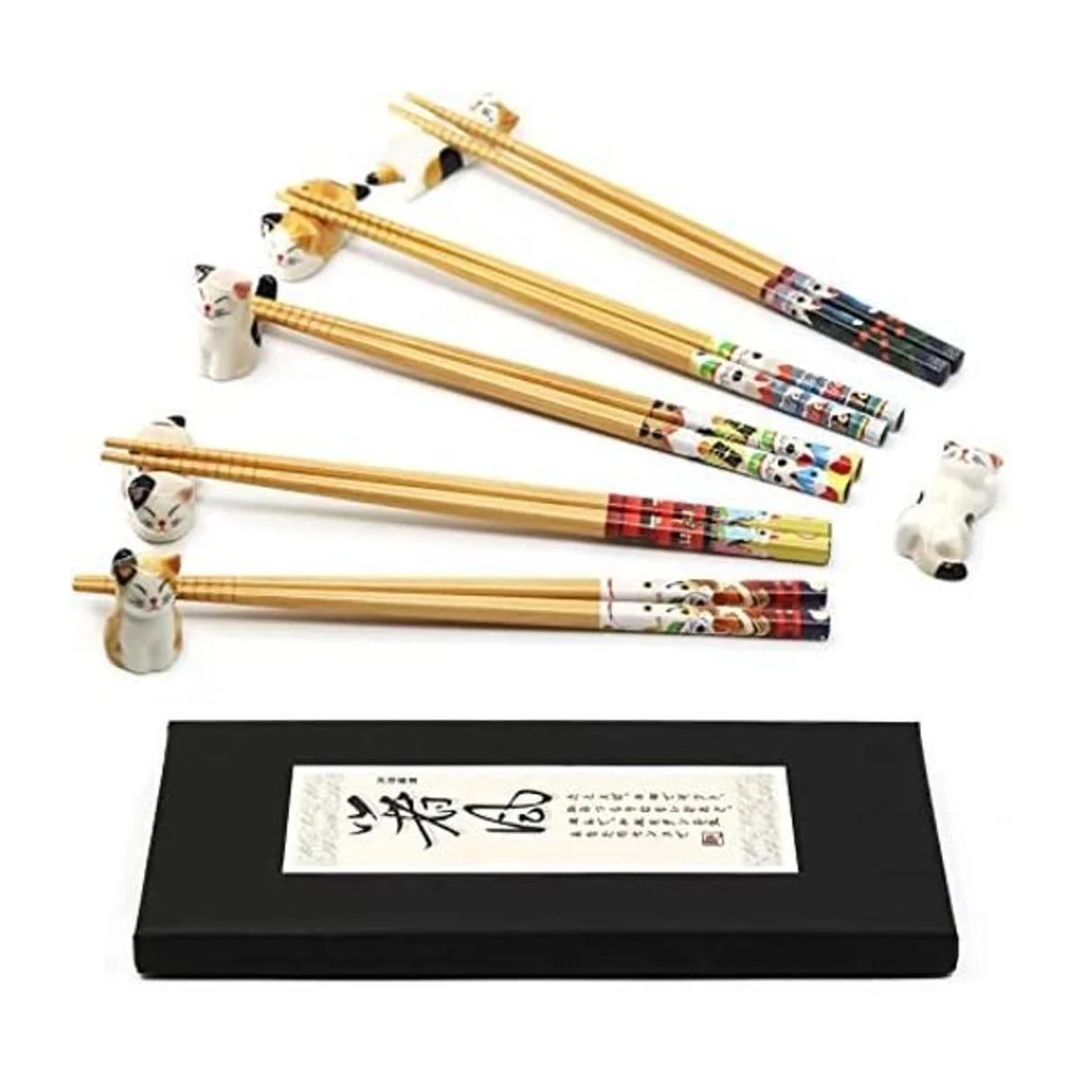 5 pares de palillos y 6 bonitos soportes para palillos de gato de la suerte, estilo japonés clásico reutilizable bambú natural antideslizante palillos antideslizantes, apto para lavavajillas, caja fuerte, palillos de China Kawaii, juego de regalo para niños gato de la suerte