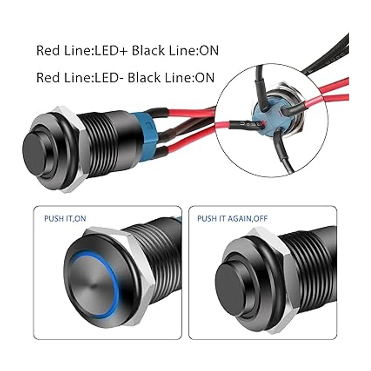 Interruptor de botón iluminado de encendido/apagado: interruptor de botón de metal de 4 pines, presiona ON, presiona de nuevo OFF. Configuración de contacto: 1NO1NC; Orificio de montaje: 0.472 in. Nota: comprueba el tamaño del producto antes de comprar.