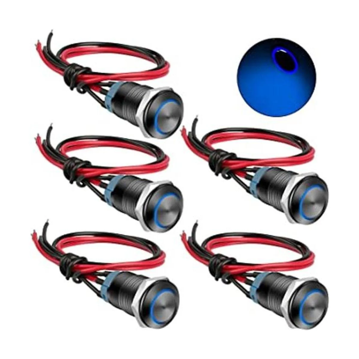 5 piezas de 12 V, 24 V, 0.472 in, impermeable, interruptor de botón de cierre con arnés de cableado y luz indicadora LED, interruptor de metal marino SPDT autobloqueable de 4 pines para barcos, autos, camiones azul