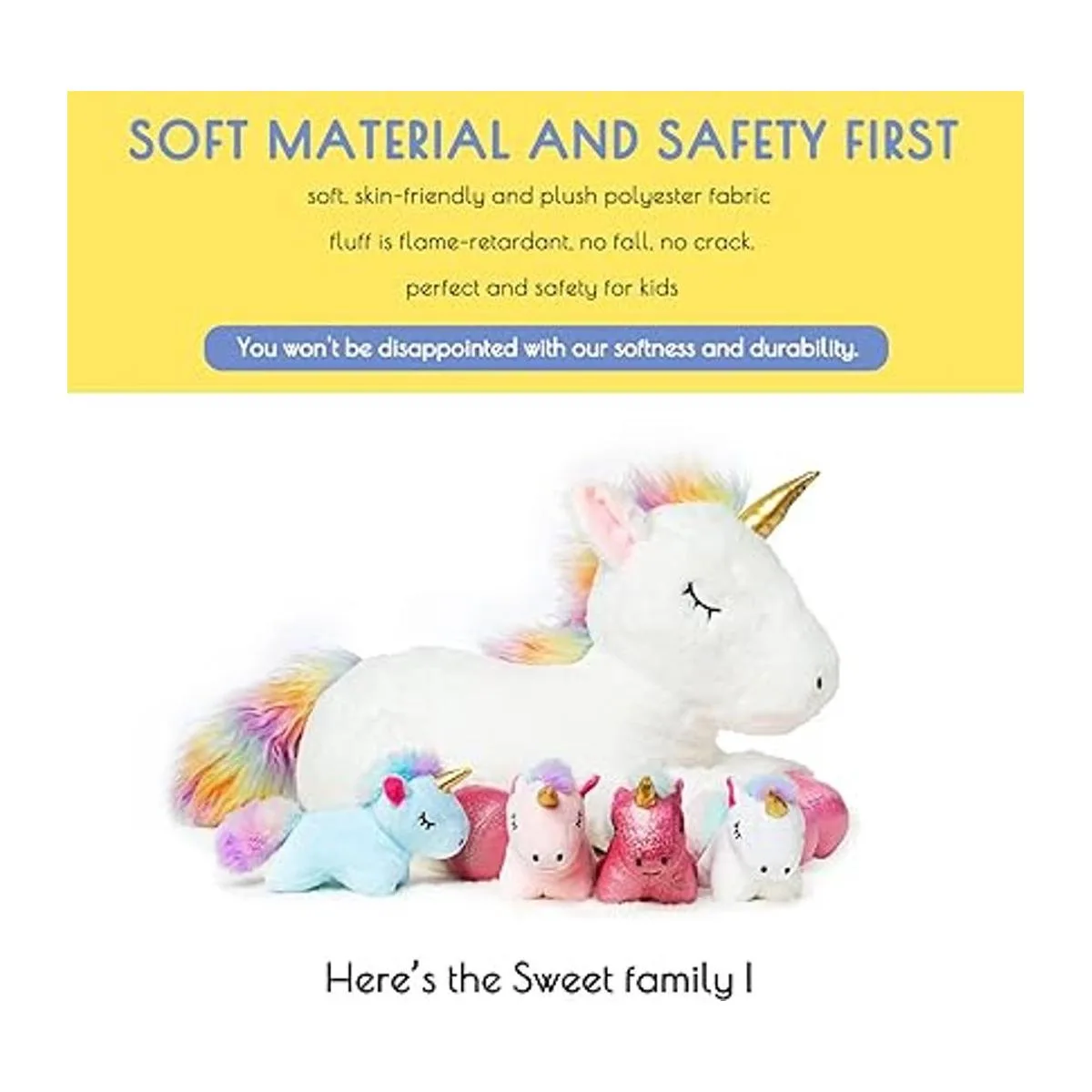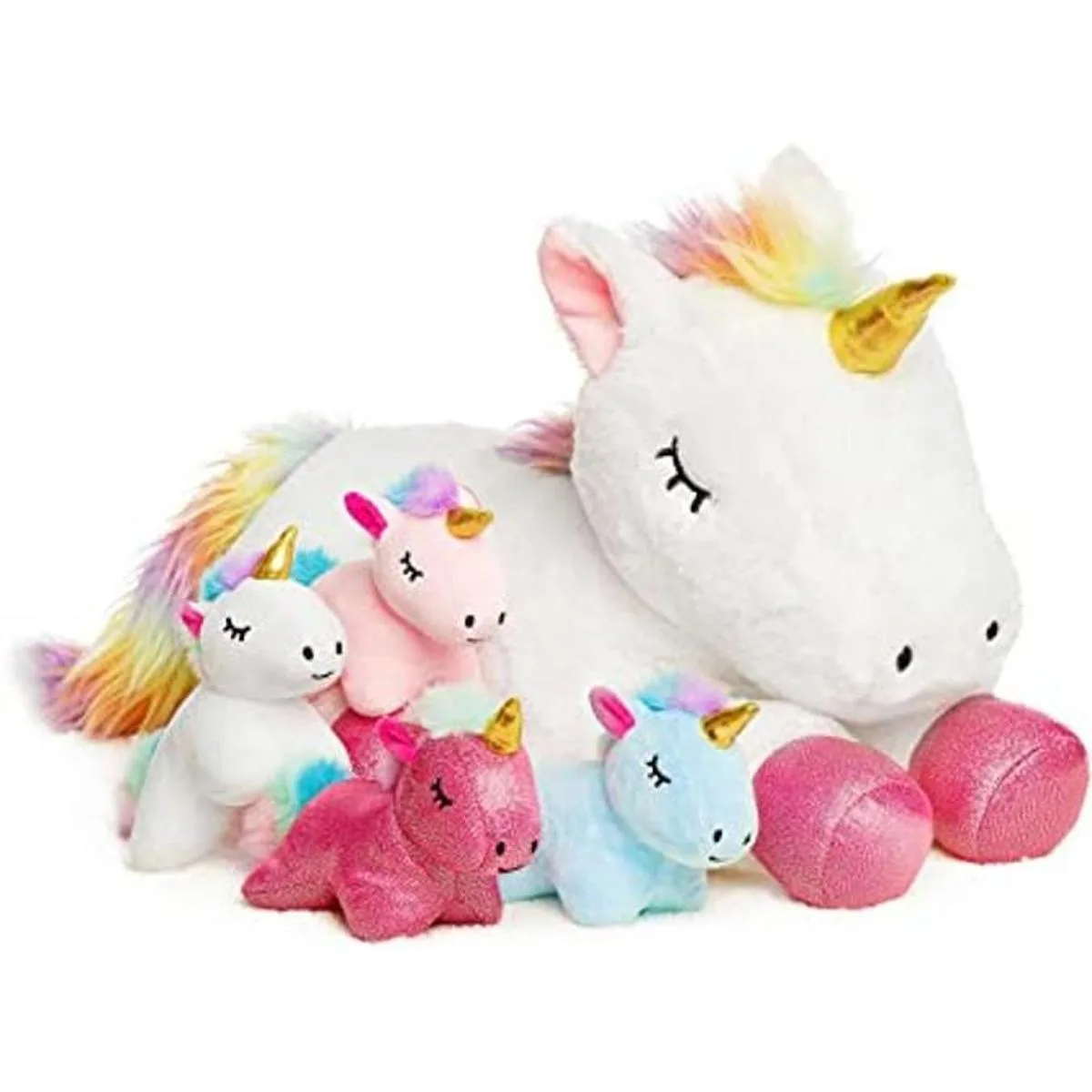 Realmente encantador y agradable: nuestro juguete de unicornio de peluche tiene un diseño único y lindo Un hermoso unicornio mamá y 5 mini unicornios bebé que son todos muy hermosos y encantadores, con ojos vivos, colas coloridas y cuernos brillantes, que exudan un tipo diferente de ternura y belleza. Creemos que todos se enamorarán de él