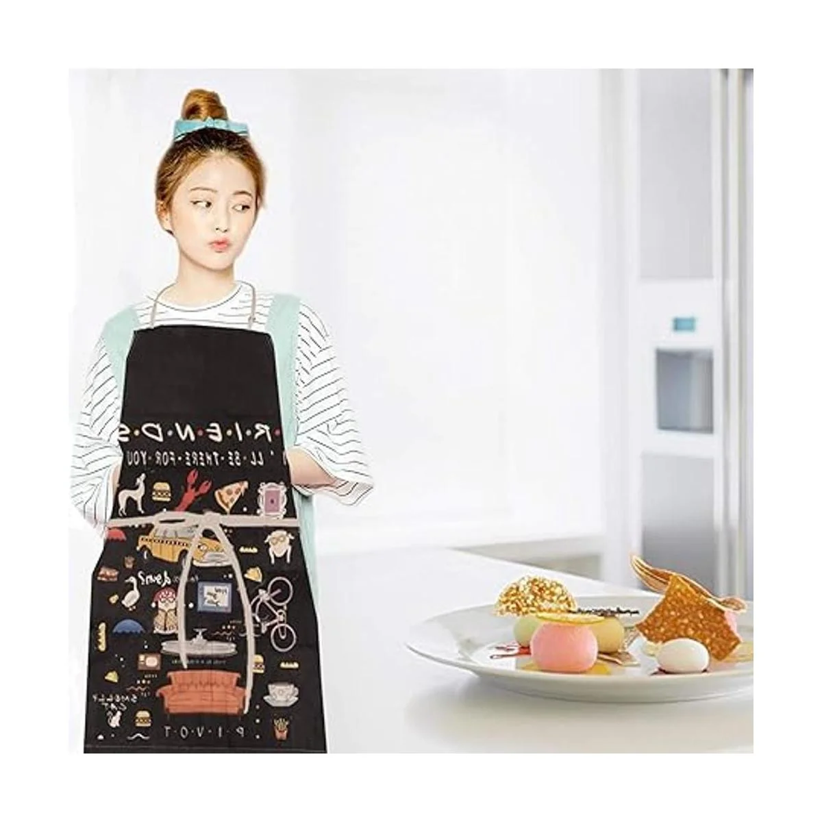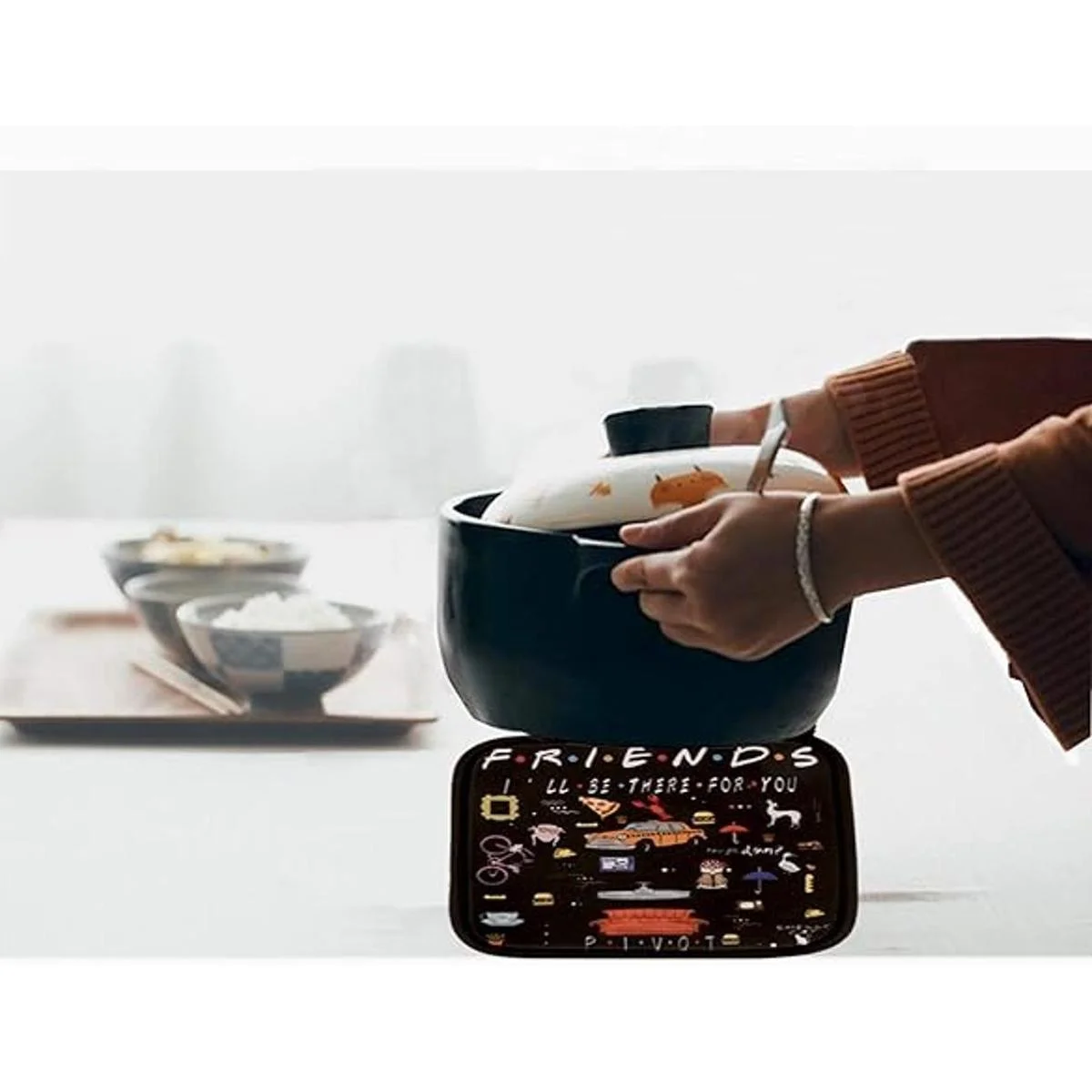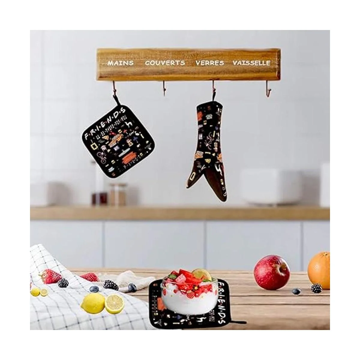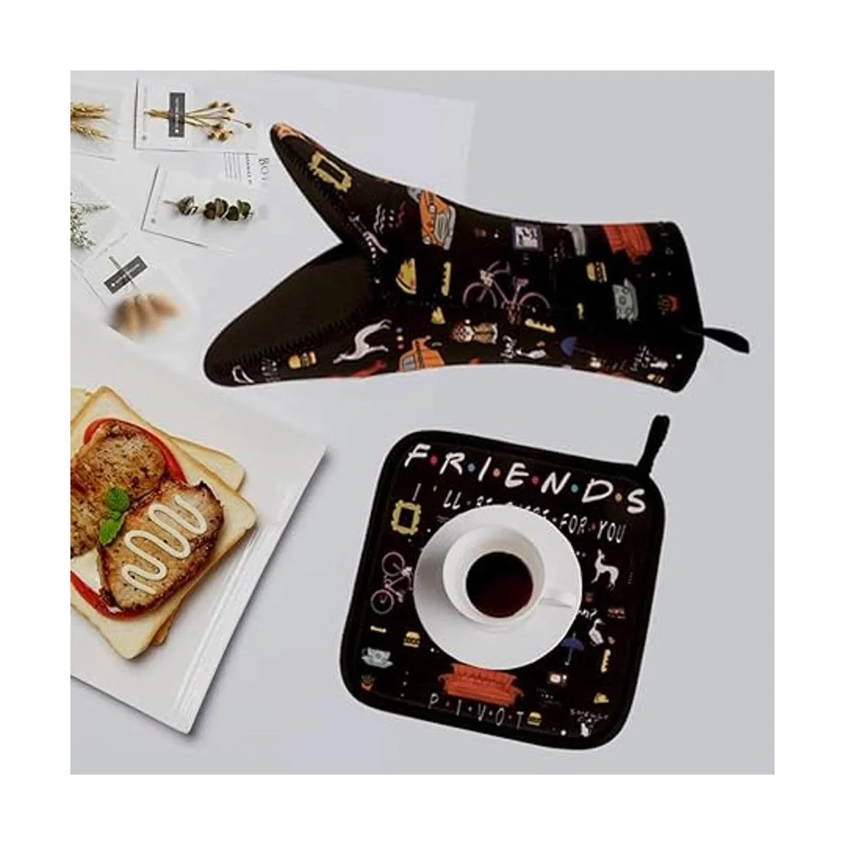 Patrón único: temática de amigos con delicados diseños de imagen, con langosta, pavo, coche, gato, pastel, marco de mirilla, televisión, bicicleta, café, perro y otros patrones famosos del programa de televisión, te darán una sensación feliz que hará que cada uno en casa sea brillante y positivo y te darán una sensación feliz cuando estés cocinando, no solo son lindos, sino también muy útiles y esperamos que los disfrutes tanto como nosotros hacer
