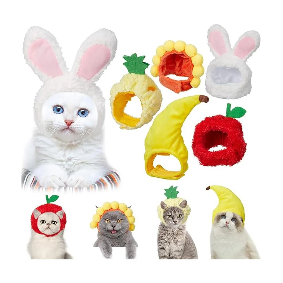 Lo que obtendrás: el paquete contiene 1 sombrero de orejas de conejo, 1 sombrero de plátano, 1 sombrero de girasol, 1 sombrero de frutas y 1 sombrero de piña, 5 piezas en total para ti, una buena combinación para hacer unas felices vacaciones para tu gato, adecuado para gatos pequeños y perros, haciendo que tu mascota se vea llamativa y elegante