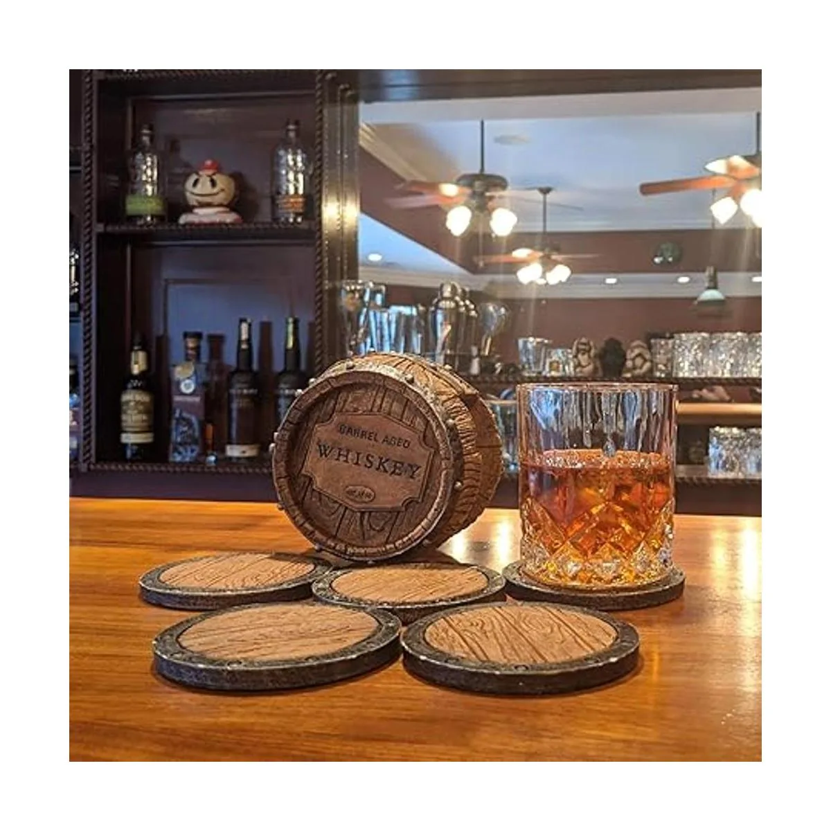 5 posavasos de barril de whisky bourbon, decoración única de bar y accesorios, posavasos de vidrio de cerveza y whisky, decoraciones del hogar para comedor o bar en casa, juego de posavasos moderno con soporte para cueva de hombre
