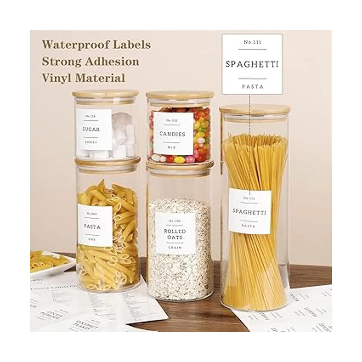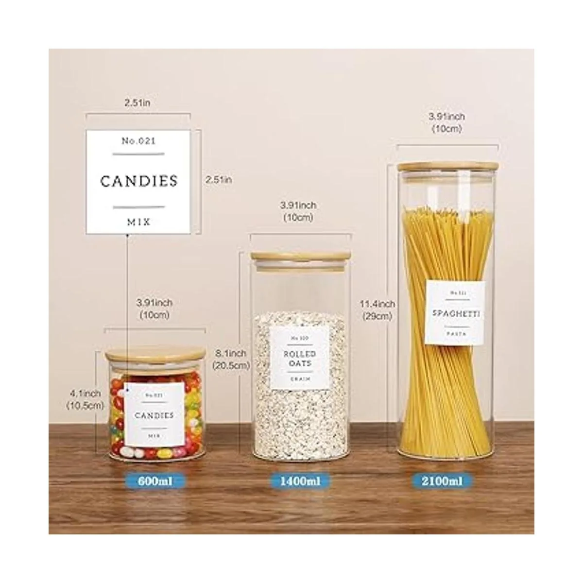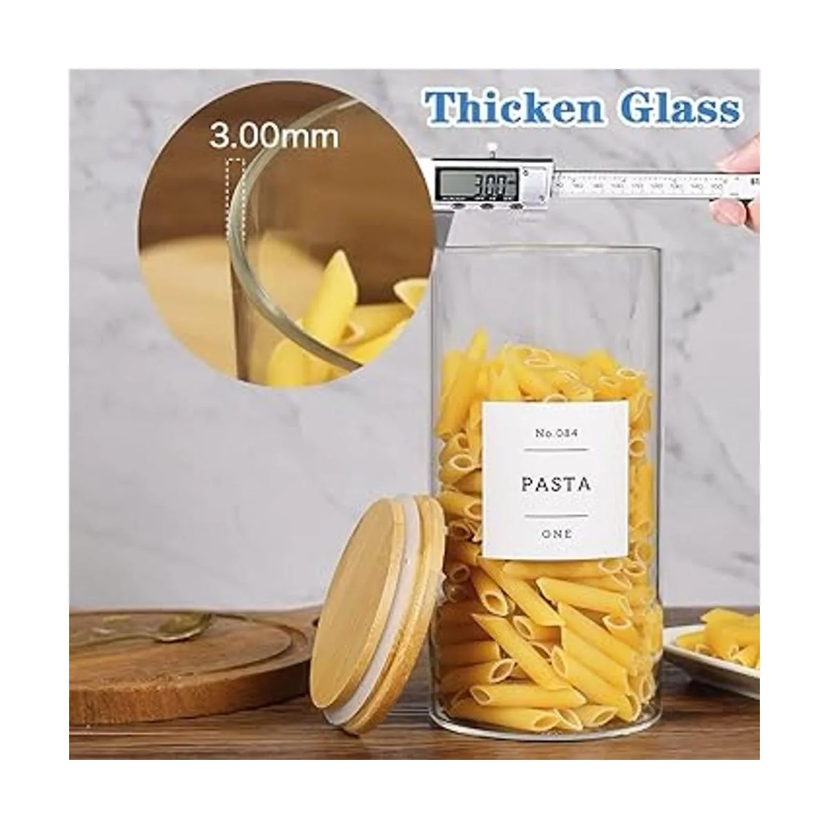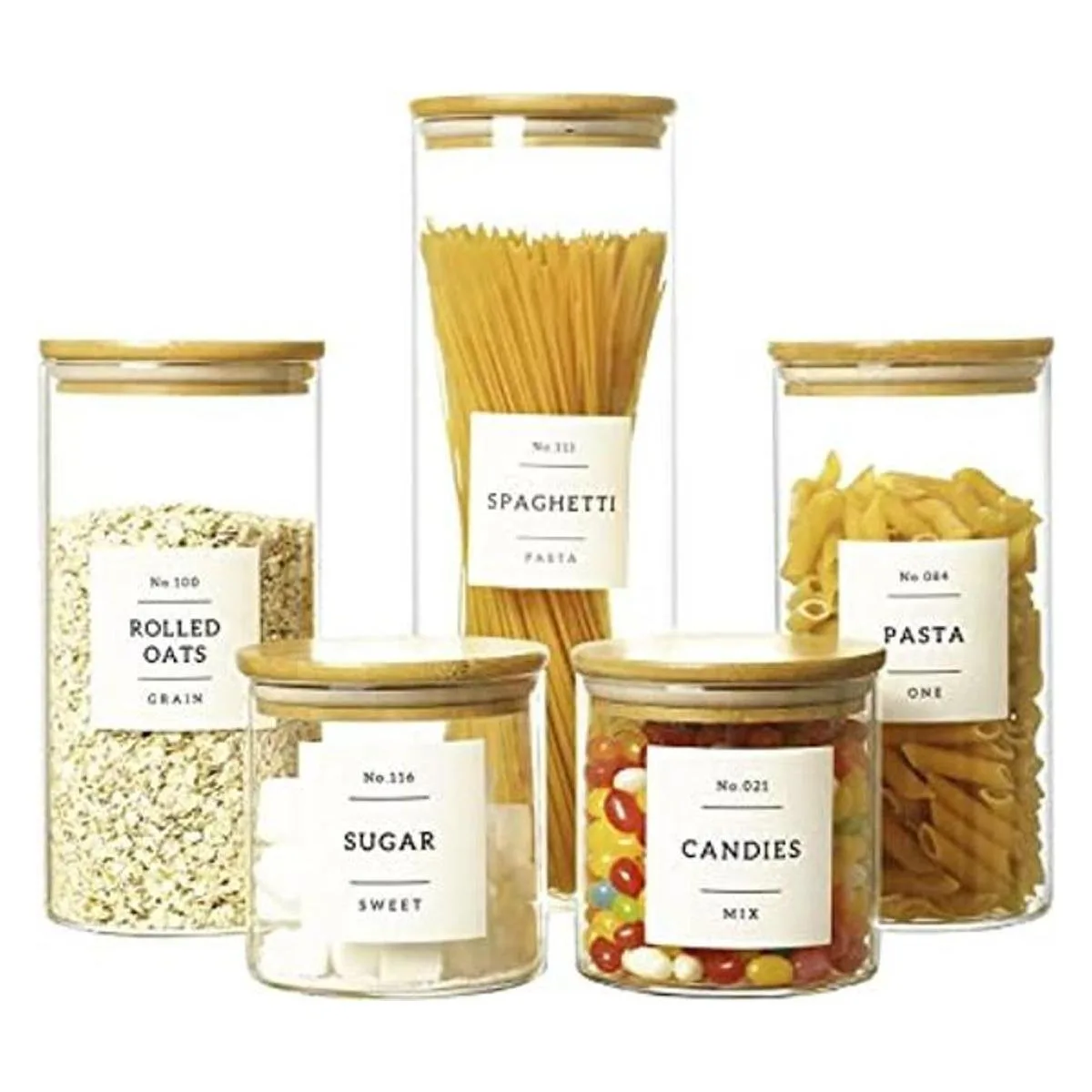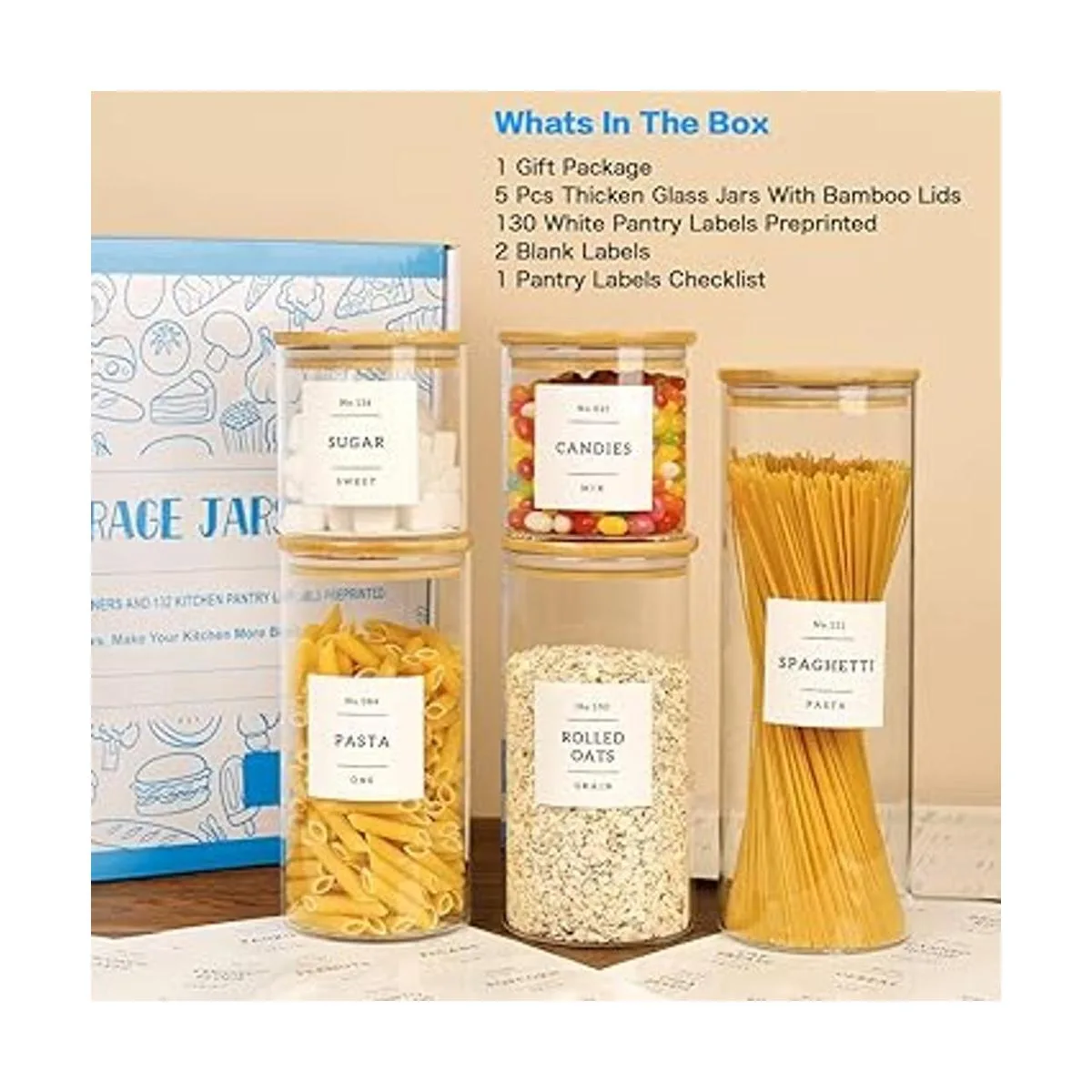 5 recipientes de almacenamiento de alimentos de vidrio con 132 etiquetas de despensa preimpresas, tarros de almacenamiento de vidrio gruesos 0.11 pulgadas con tapa de bambú hermética, juego de recipientes de cocina apilables para dulces, galletas, arroz, azúcar, harina