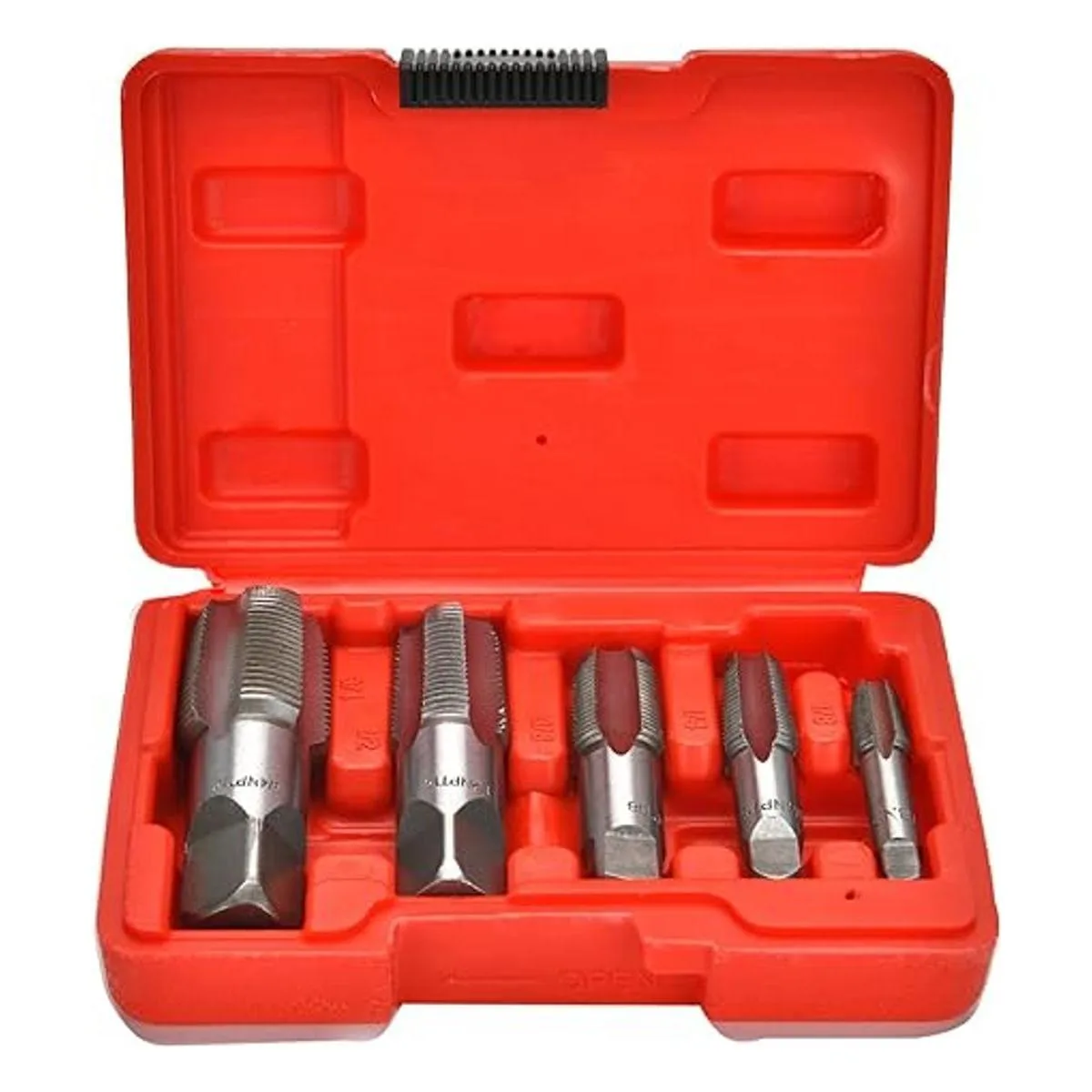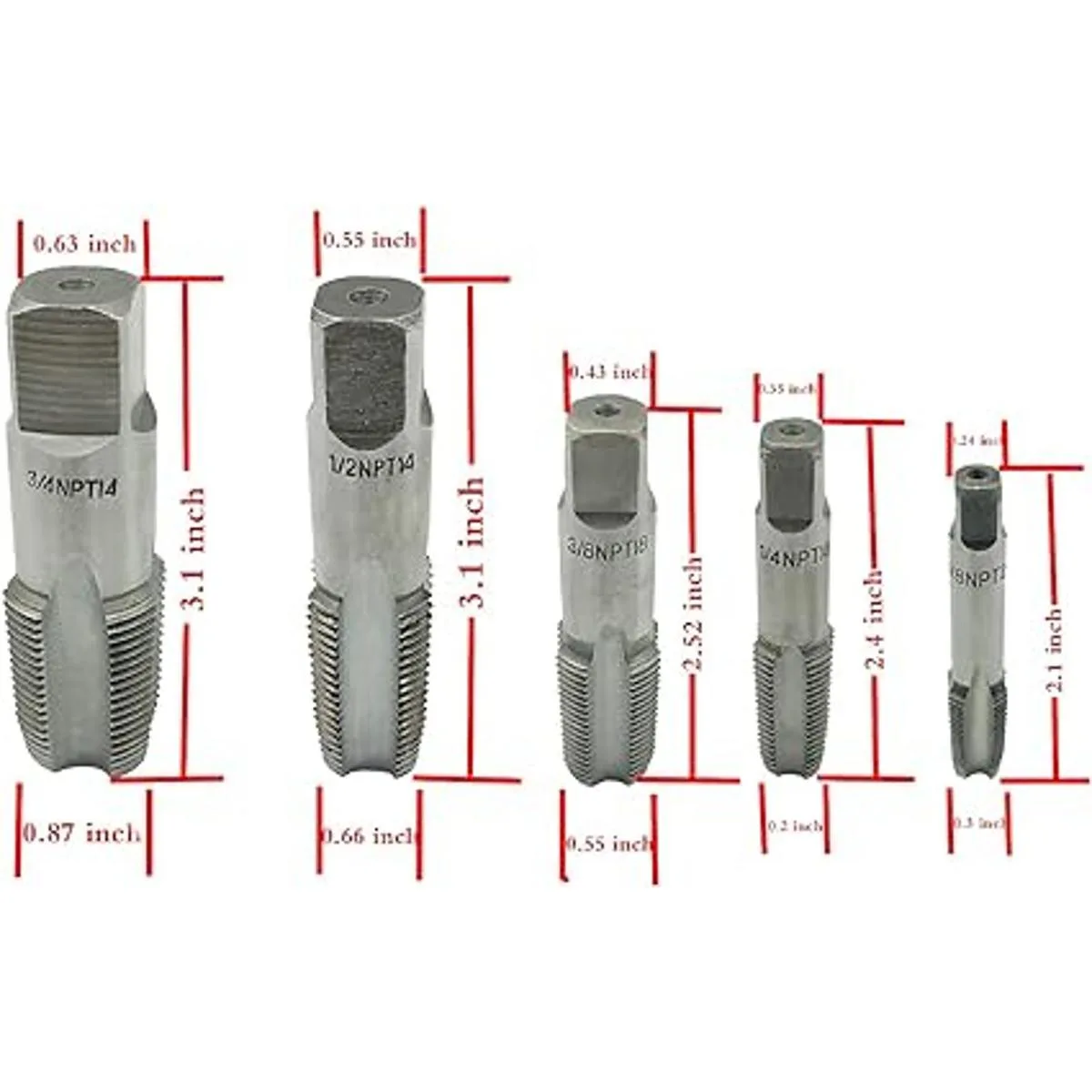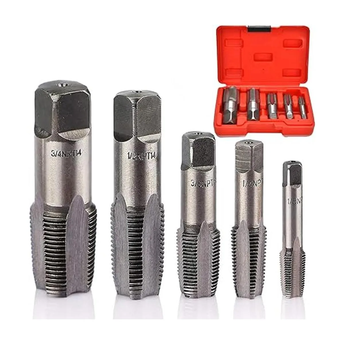 5 grifos de tubería NPT utilizados para roscas limpias o dañadas o de tubería de atasco, corta roscas internas en tuberías. Ideal para accesorios de tubería. Disponible en tubo de tubo nacional NPT y estándar británico de tubería BSP. Incluye tamaño de enseñanza: 1/8 27 NPT, 1/4 18 NPT, 3/8 18 NPT, 1/2 14 NPT, 3/4 14 NPT.
