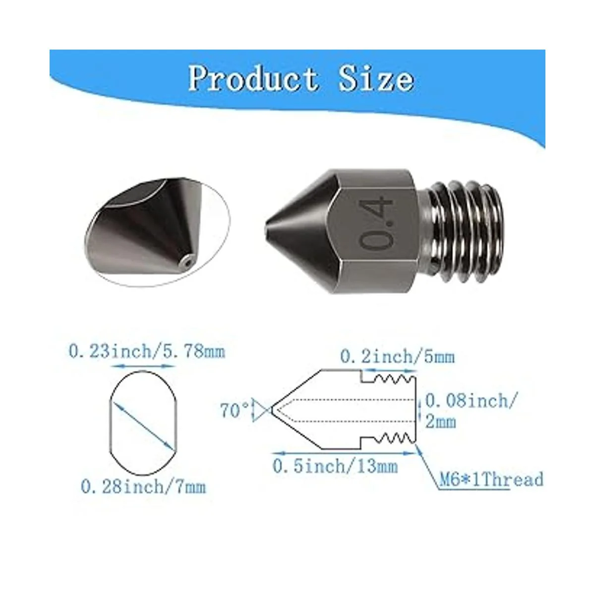 Resistencia a altas temperaturas: la boquilla puede soportar temperaturas de hasta 450 grados, adecuada para impresión 3D a alta temperatura, no solo apta para filamentos comunes de impresora 3D de 0.069 in, sino también puede imprimir filamentos de PLA, ABS a fibra de carbono, incluso PEK.