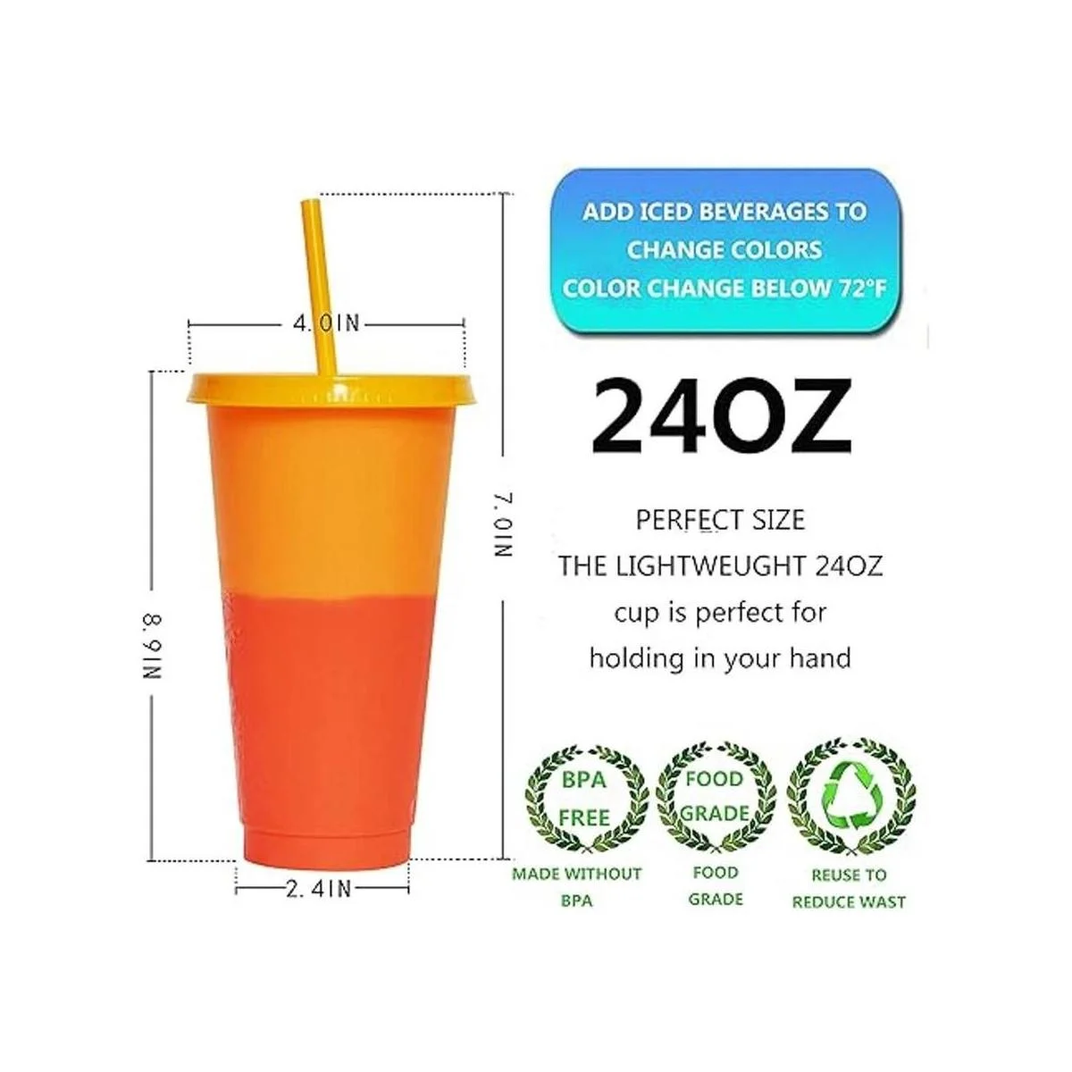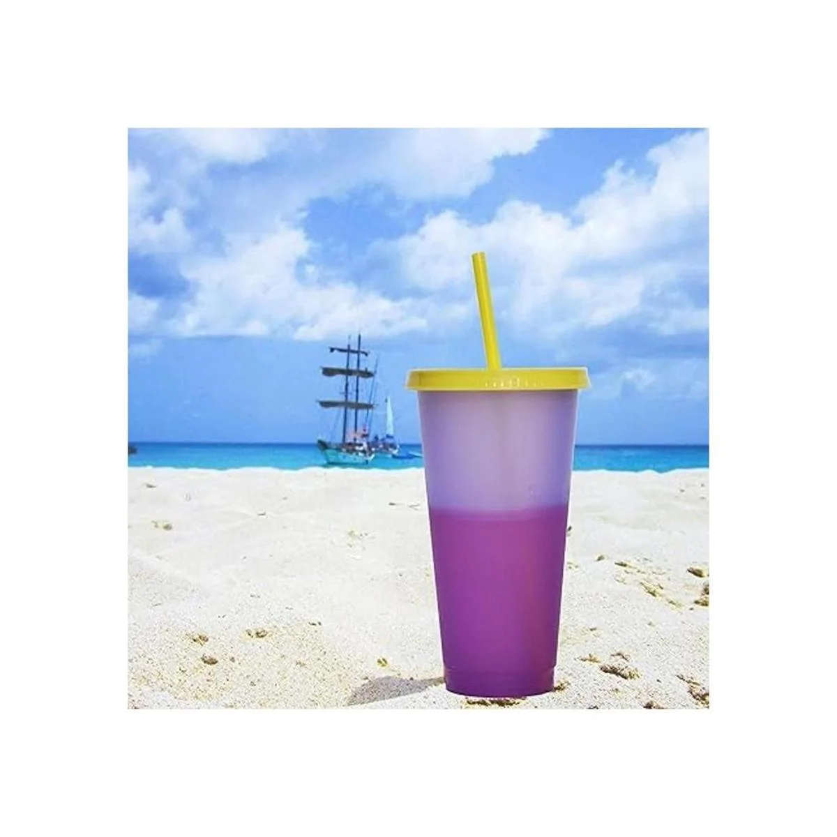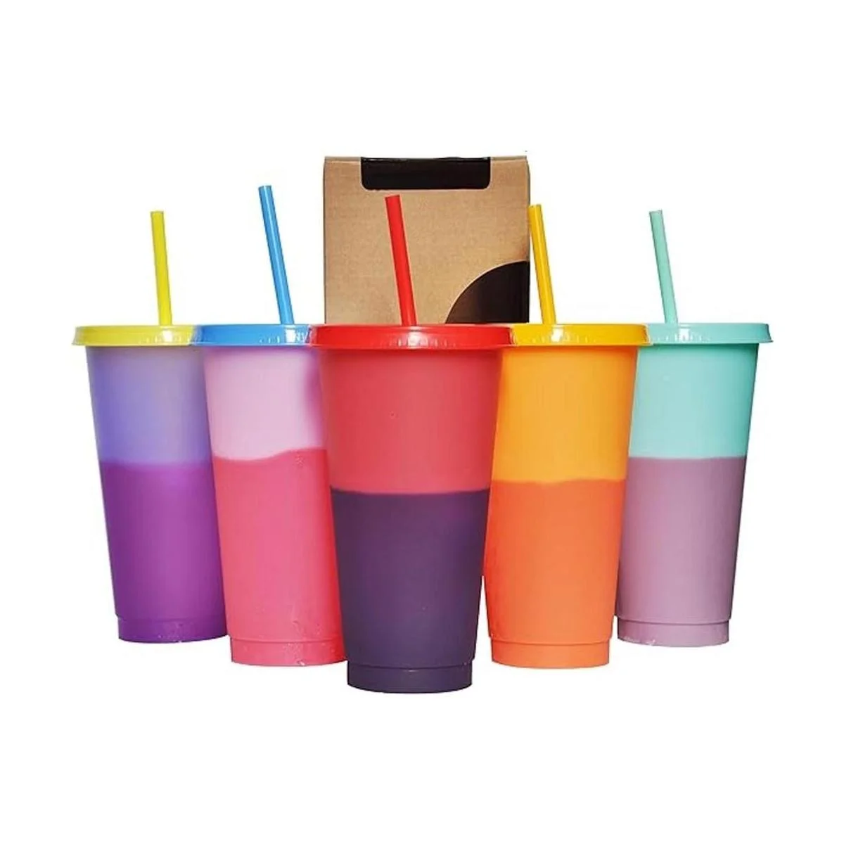 Paquete de 5 vasos reutilizables para agua fría que cambian de color. Taza que cambia de color de 24 onzas con popote y tapa.