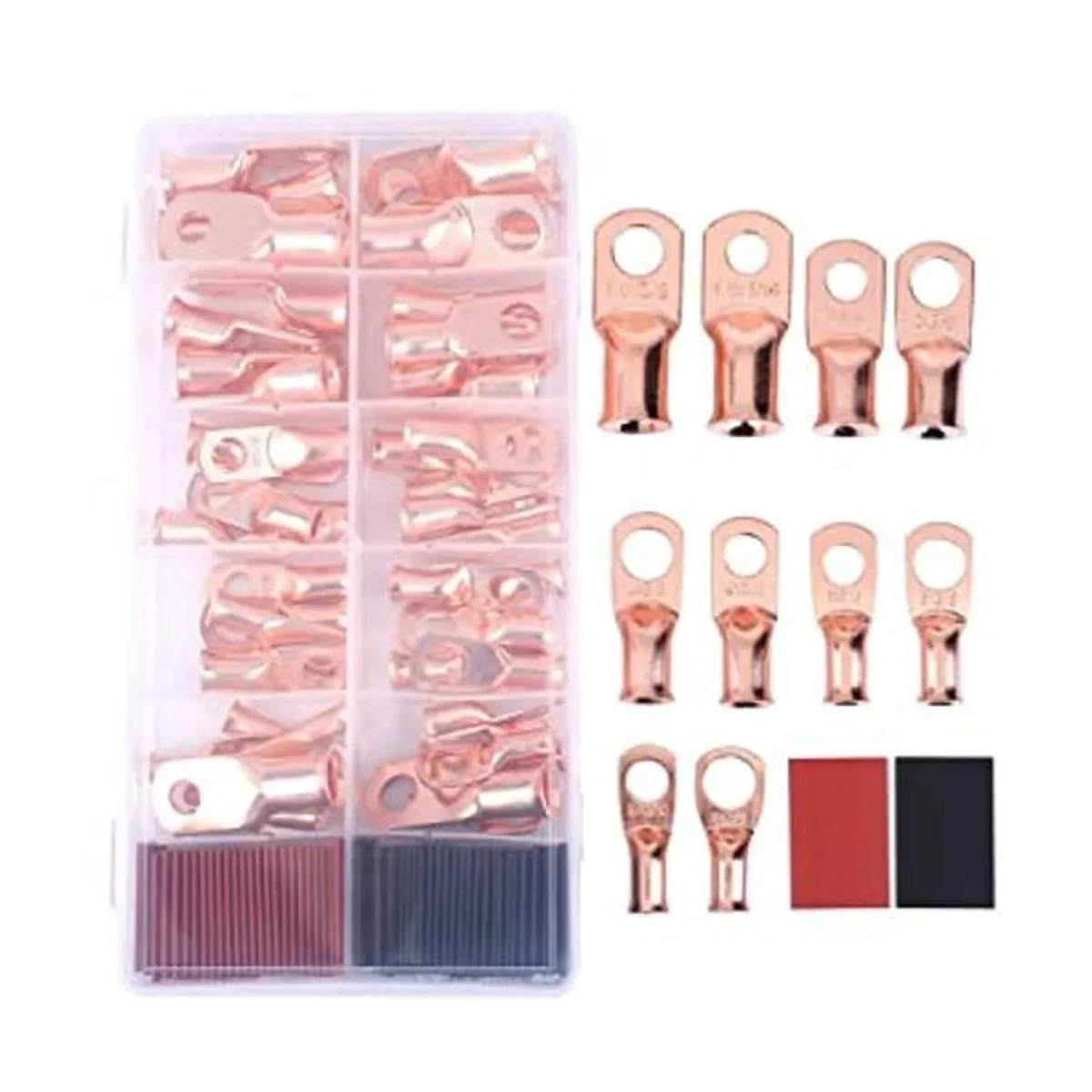 50 clavijas de batería de alambre de cobre con tubos termorretráctiles 21, 10, 2, 4, 6, 8 AWG, conector de terminal de anillo tubular con extremo desnudo cerrado para cable eléctrico, kit surtido de 10 tamaños