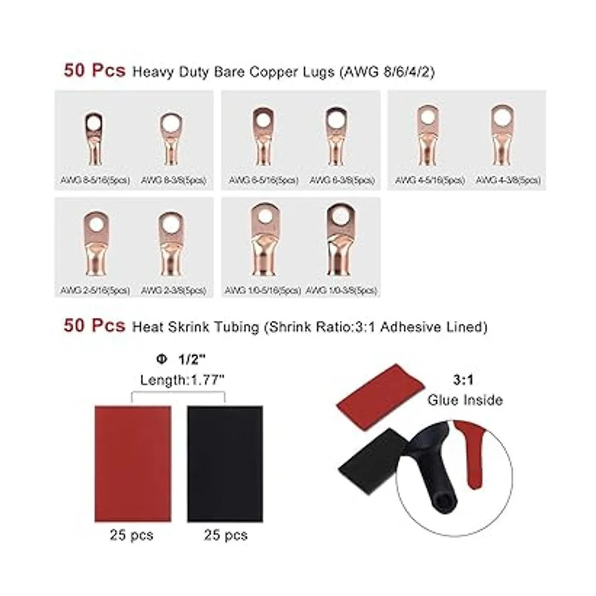 Extremos del cable de la batería: 10 tamaños AWG, 5 piezas/tamaño. AWG 1/0 5/16, AWG 1/0 3/8, AWG 2 3/8, AWG 2 5/16, AWG 4 3/8, AWG 4 5/16, AWG 6 5/16, AWG 6 3/8, AWG 8 5/16, AWG 8 3/8
