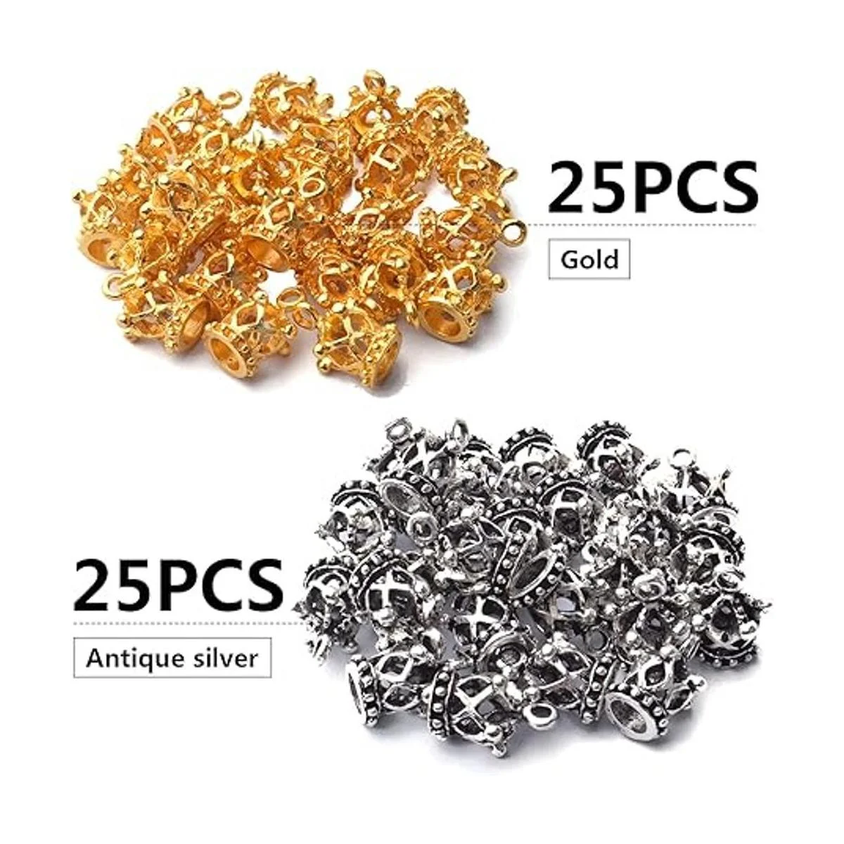 El paquete incluye: 50 abalorios de corona en total, 2 colores plata antigua y oro, 25 piezas de cada color; puedes utilizar estos colgantes para hacer hermosas manualidades de joyería.