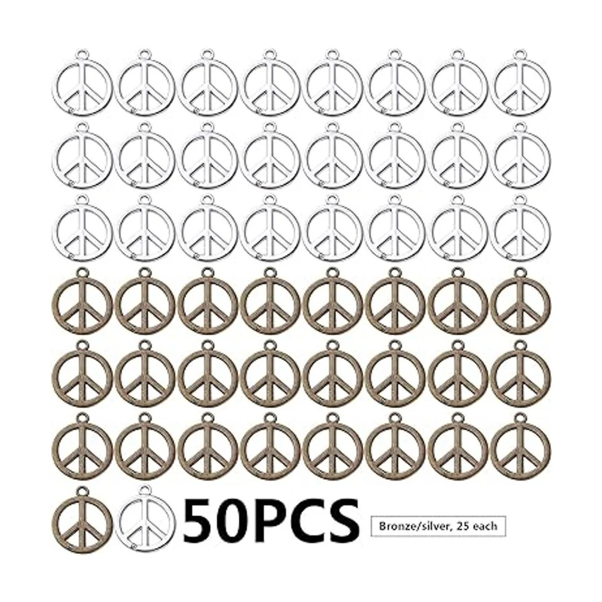 El paquete incluye: recibirás 50 abalorios de paz en el paquete, 2 colores bronce antiguo y plata antigua, 25 unidades de cada color. Estos abalorios harán que tus joyas estén más a la moda.
