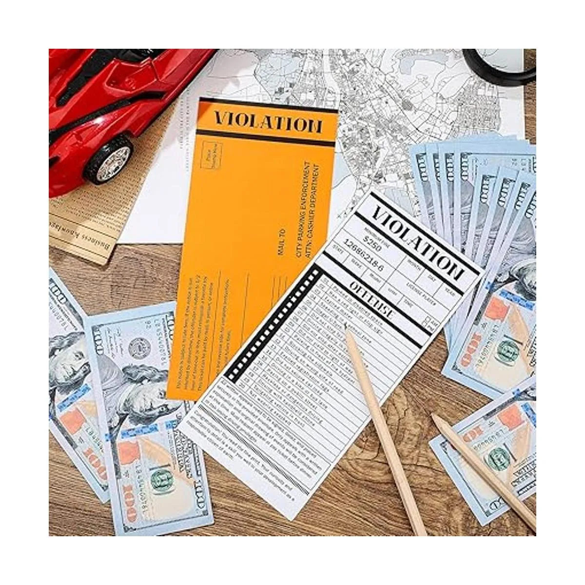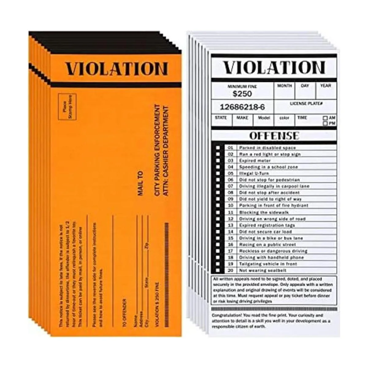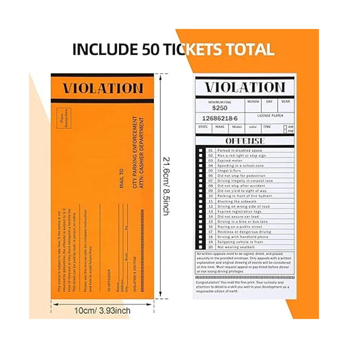El paquete incluye: un paquete viene con 1 pila con 50 hojas que acompañan mucho espacio para escribir detalles del conductor y una lista de 20 delitos divertidos para elegir; su diseño creativo y realista sorprenderá a tus amigos, añadiendo mucha diversión y alegría a su vida