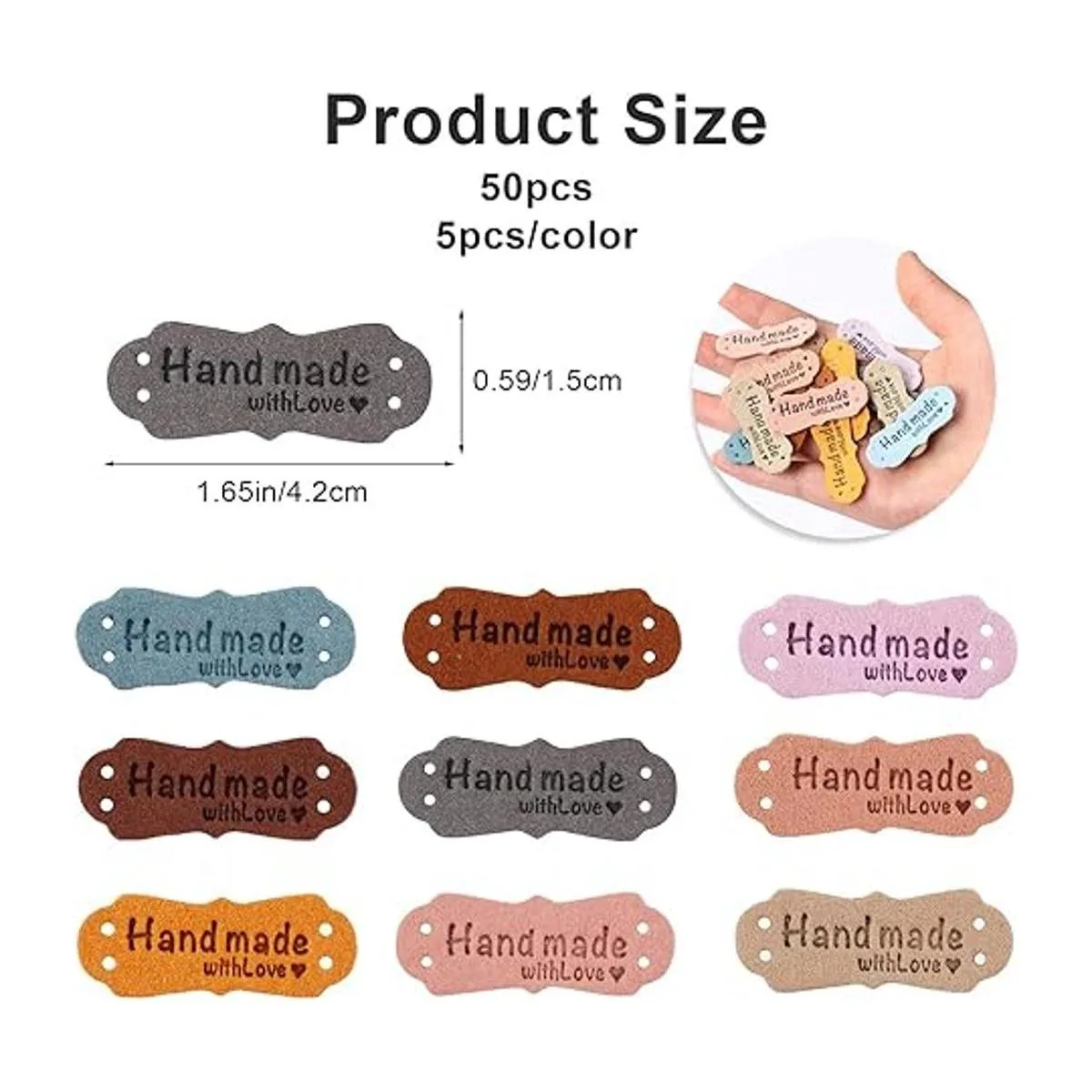 50 etiquetas de cuero hechas a mano, etiquetas de costura para artículos hechos a mano, etiquetas de cuero coloridas en relieve hechas a mano con amor, etiquetas hechas a mano con agujeros para jeans, bolsas, zapatos, sombreros, 10 colores, 0.591 x 1.654 in